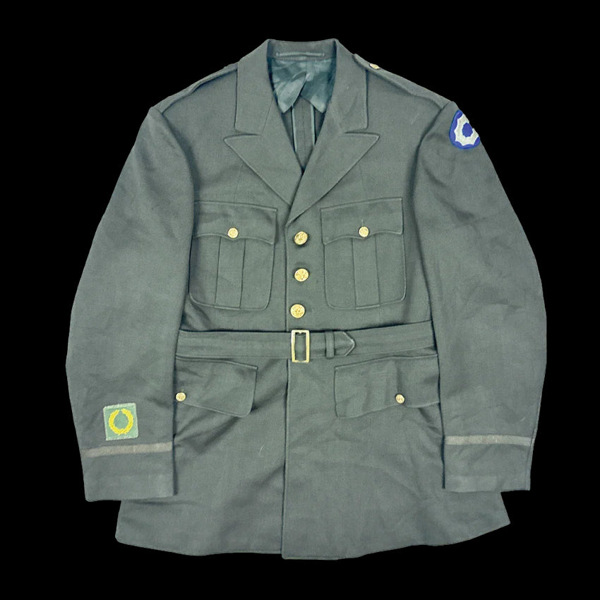 US Army officer dress jacket from the 1950s. Manufactured by L Strauss & Co, Indianapolis. The jacket features multiple pockets and an integrated waist belt.