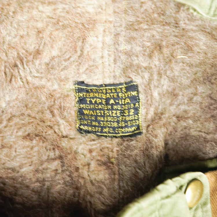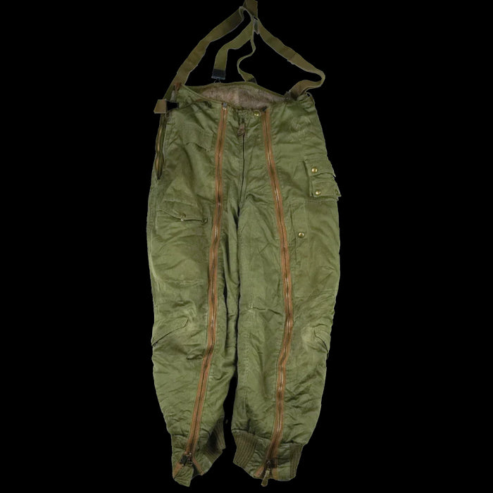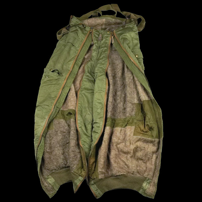 US Army Air Force Type A-11A cold weather flying trousers. This is a military surplus insulated trouser designed for aircrew use in cold conditions. The trousers feature an alpaca wool lining for insulation.