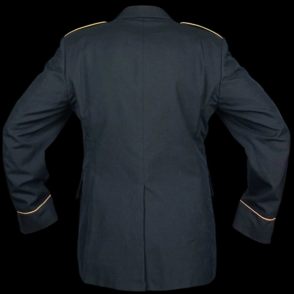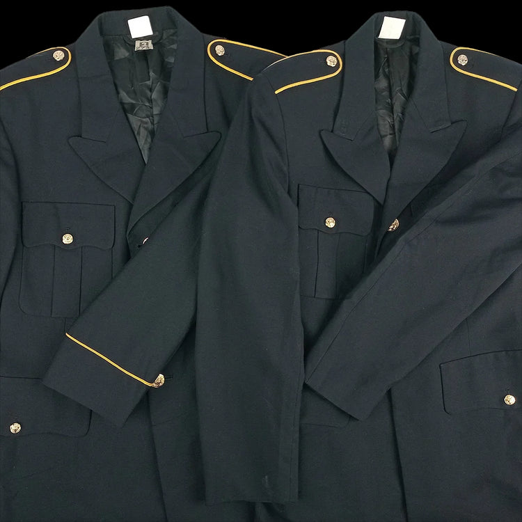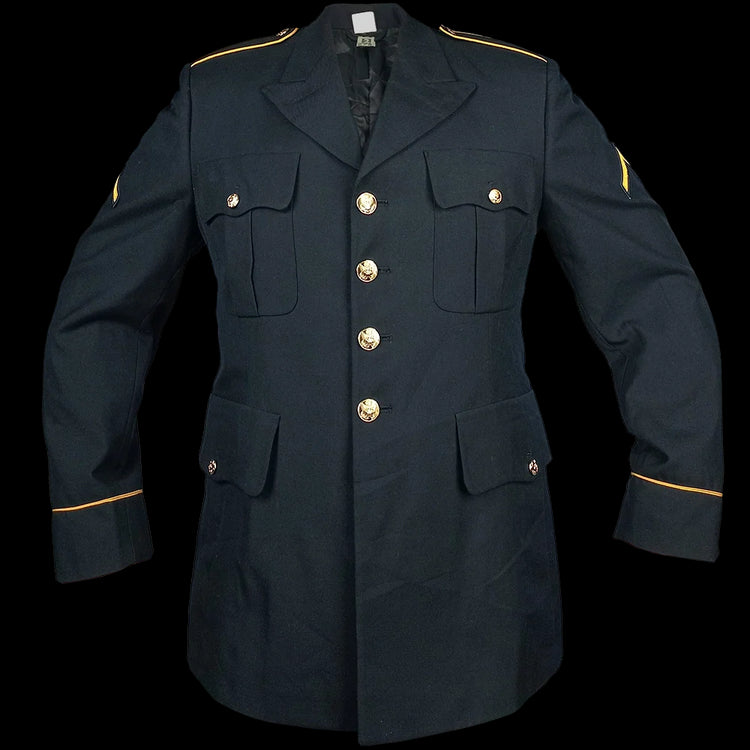 A tailored, single-breasted very dark blue coat featuring gold buttons and epaulettes from the US Army. Within this bunch are a mix of jackets with thin yellow arm bands or without, and if patches are present, will vary. Designed and worn for formal and ceremonial occasions, it reflects US Army tradition and professionalism, offering a distinguished, sharp appearance that honours military heritage and service excellence.