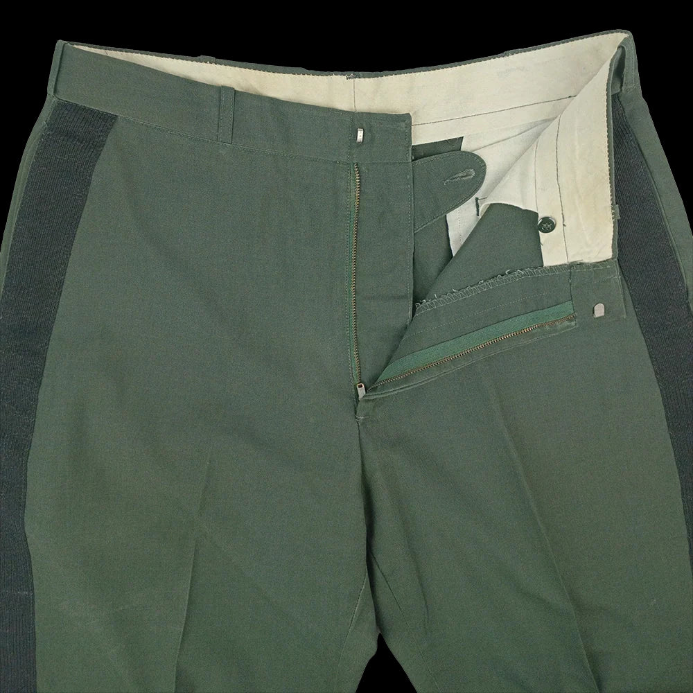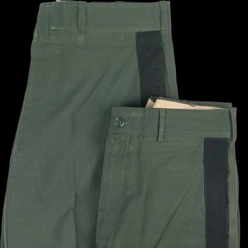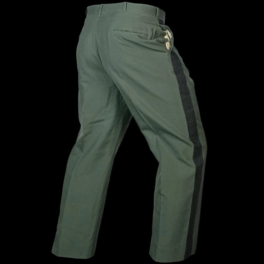 Boss man pants, the pants with the stripe. These are sold as a mix of models over time since issued - the compositional percent and fabric weave varies and are picked at random. Some of these may not be hemmed and as dress trousers, sit a bit higher on the waist - we recommend sizing up.