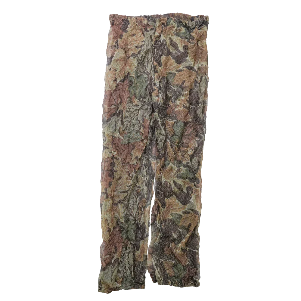 US made Bug Tamer mesh hunting trousers in a leaf-pattern camouflage. Lightweight construction with an outer mesh shell and internal net lining.