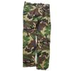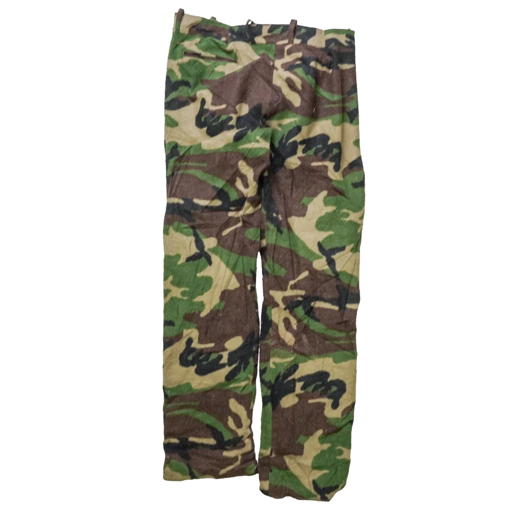 US made Cabela’s woodland camouflage fleece trousers. Heavy fleece outer in classic woodland pattern with a brown interior lining. Zip fly with metal top button closure and belt loops at the waistband.