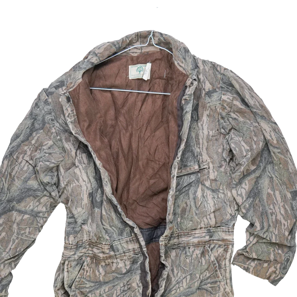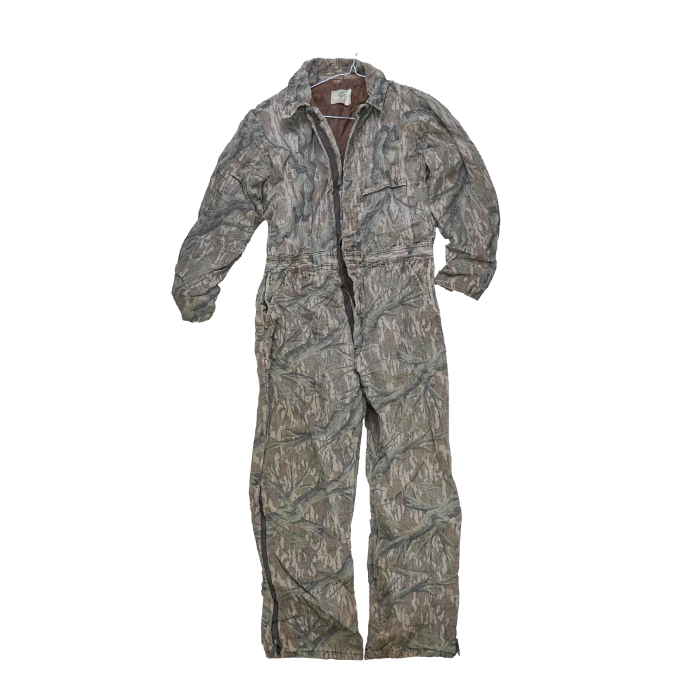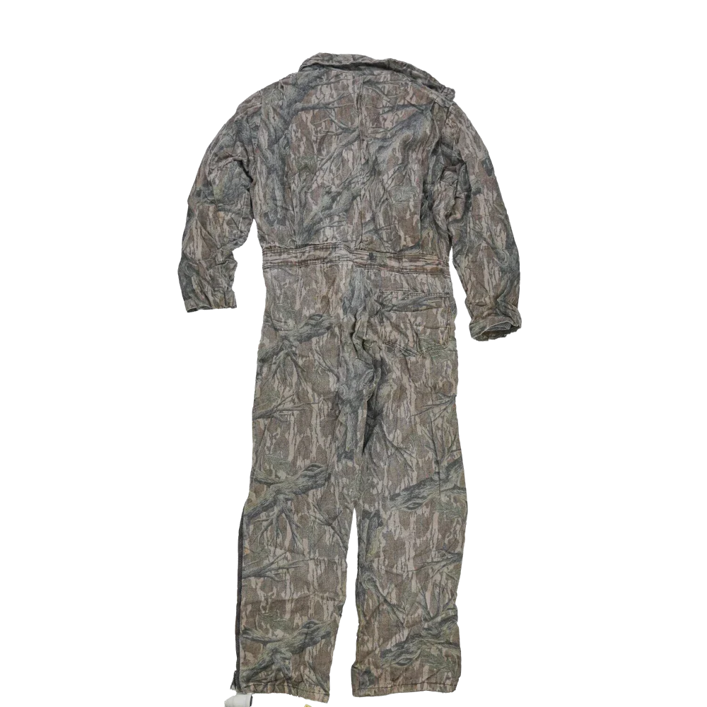 US-made Mossy Oak lined coveralls in a medium size. This one-piece garment features an insulated lining and full coverall construction designed for warmth and coverage.