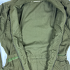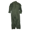 Surplus US Navy flying coveralls in olive, featuring a full zip front and multiple utility pockets across the chest, waist, thighs, and lower legs. This example includes hook and loop adjusters at the cuffs and waist, was manufactured in 1969, and is sized 40 Regular.