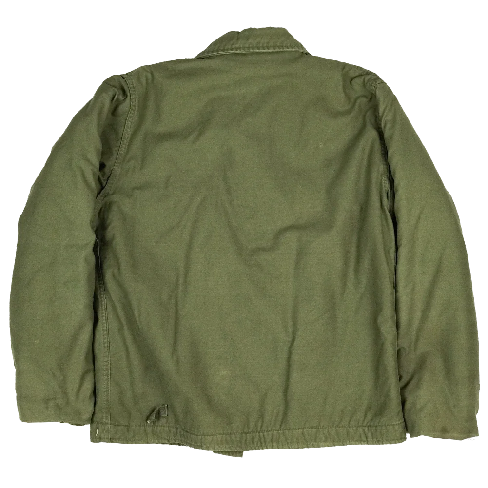 This is a US Navy A-2 deck jacket in a large size. It is a heavy outer jacket with a robust construction typical of the A-2 pattern.