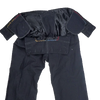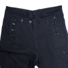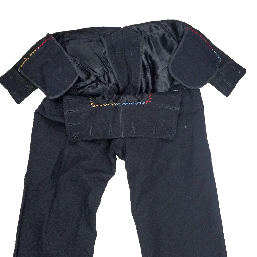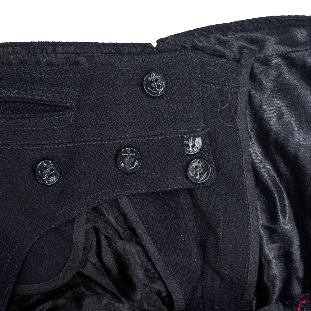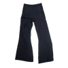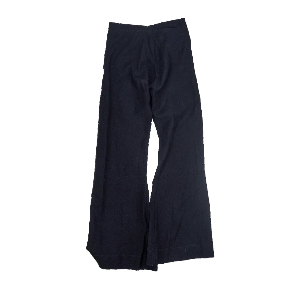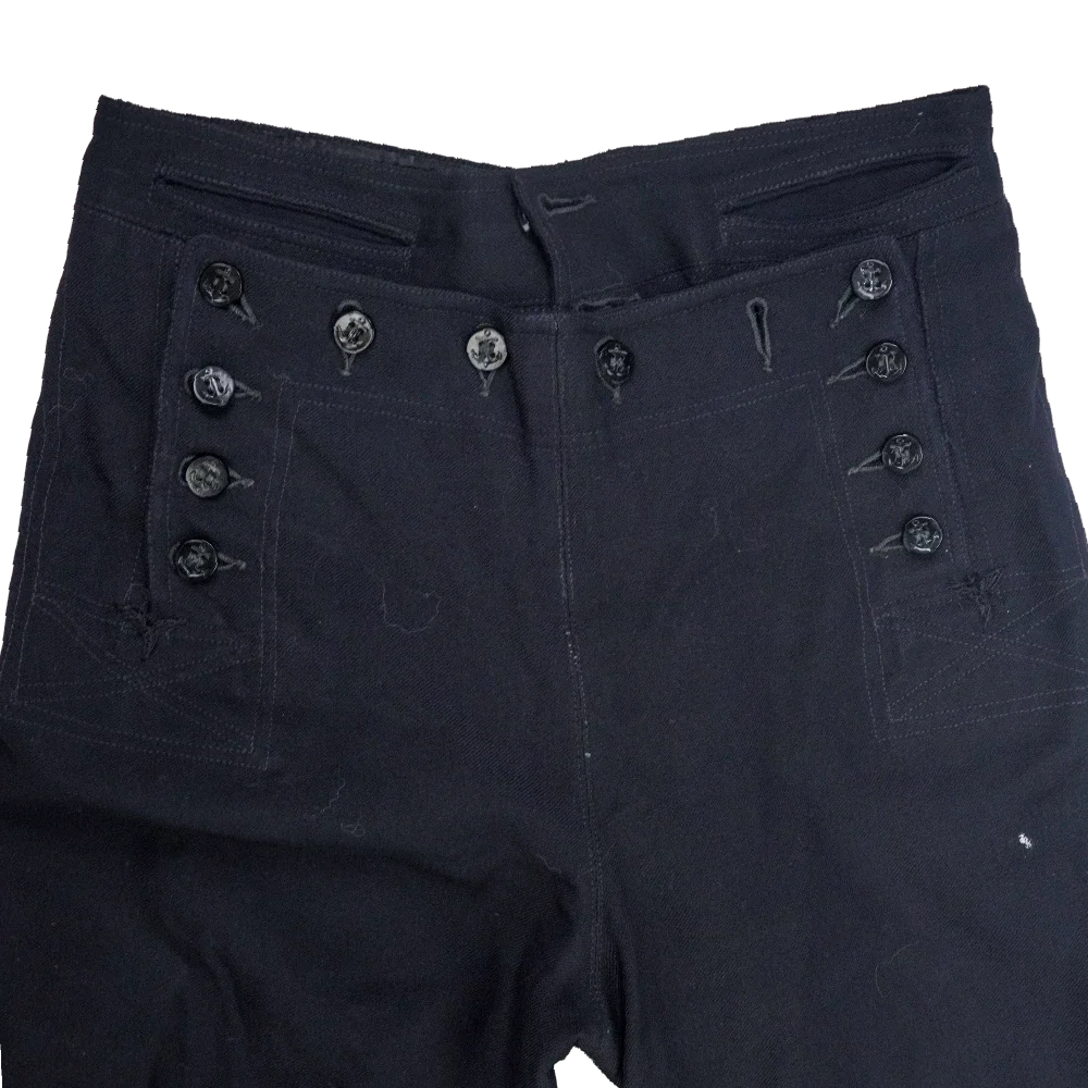 US Navy early model sailor pants in used/fair condition. Features a traditional button-front flap closure with multiple anchor-embossed buttons and a high-waisted cut. Straight leg with a slight flare at the hem and a dark navy finish.
