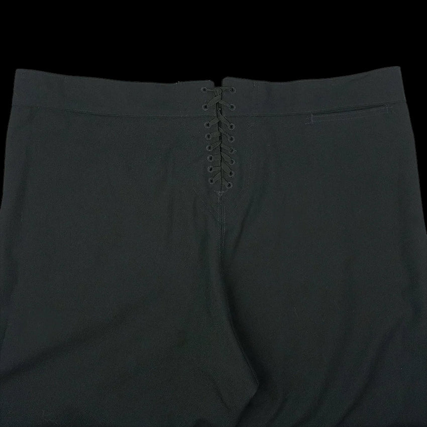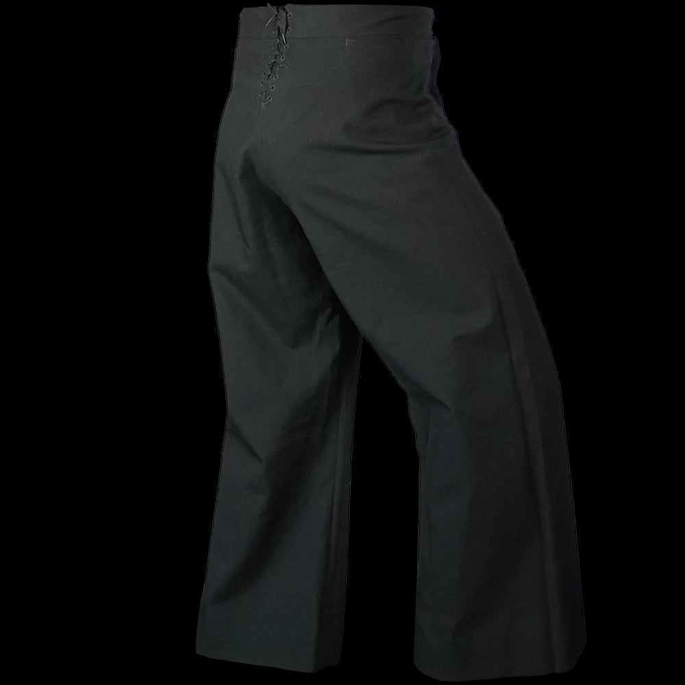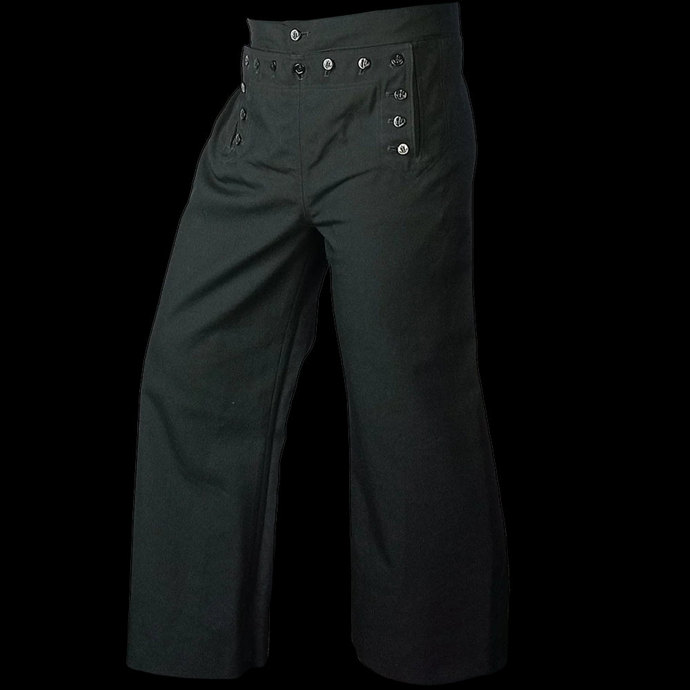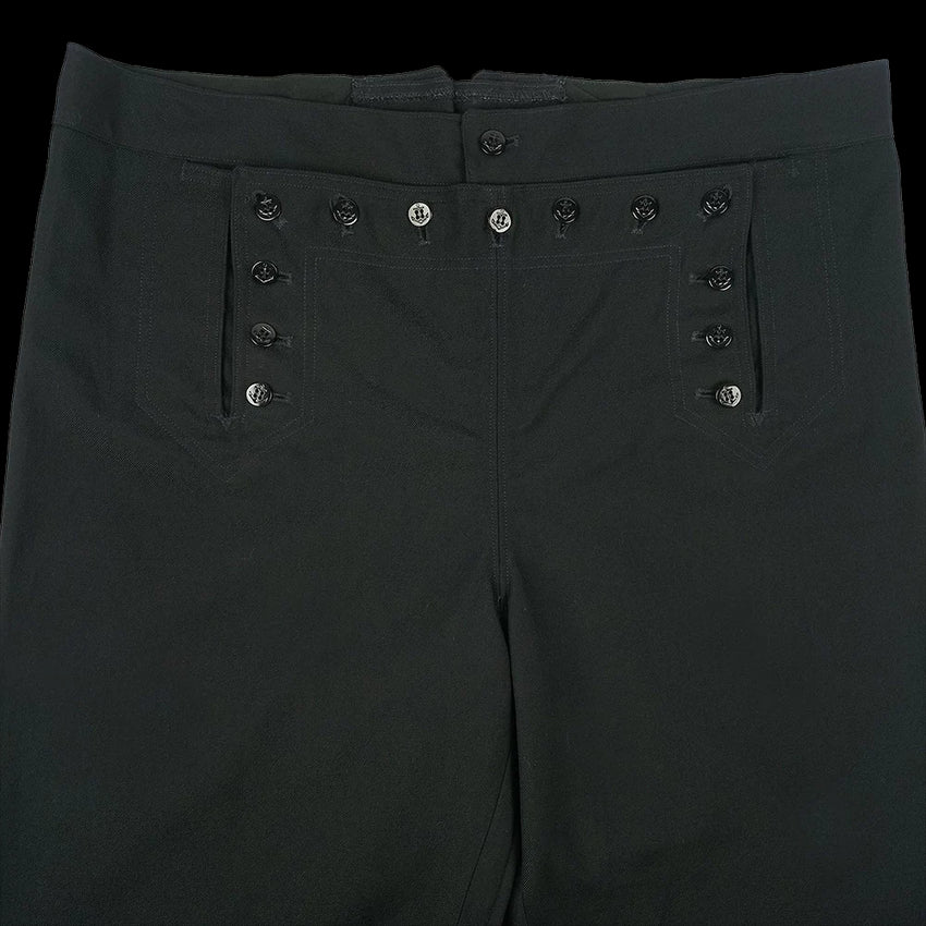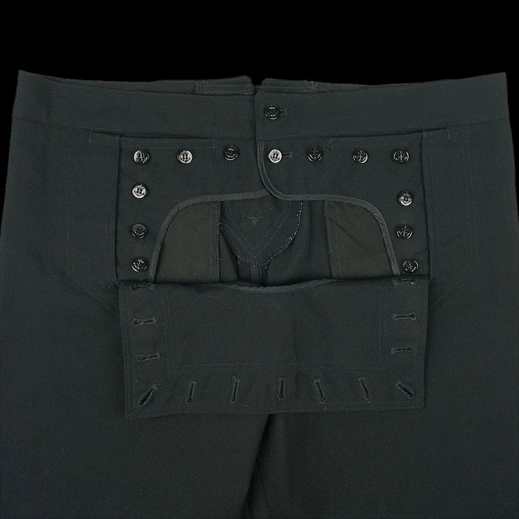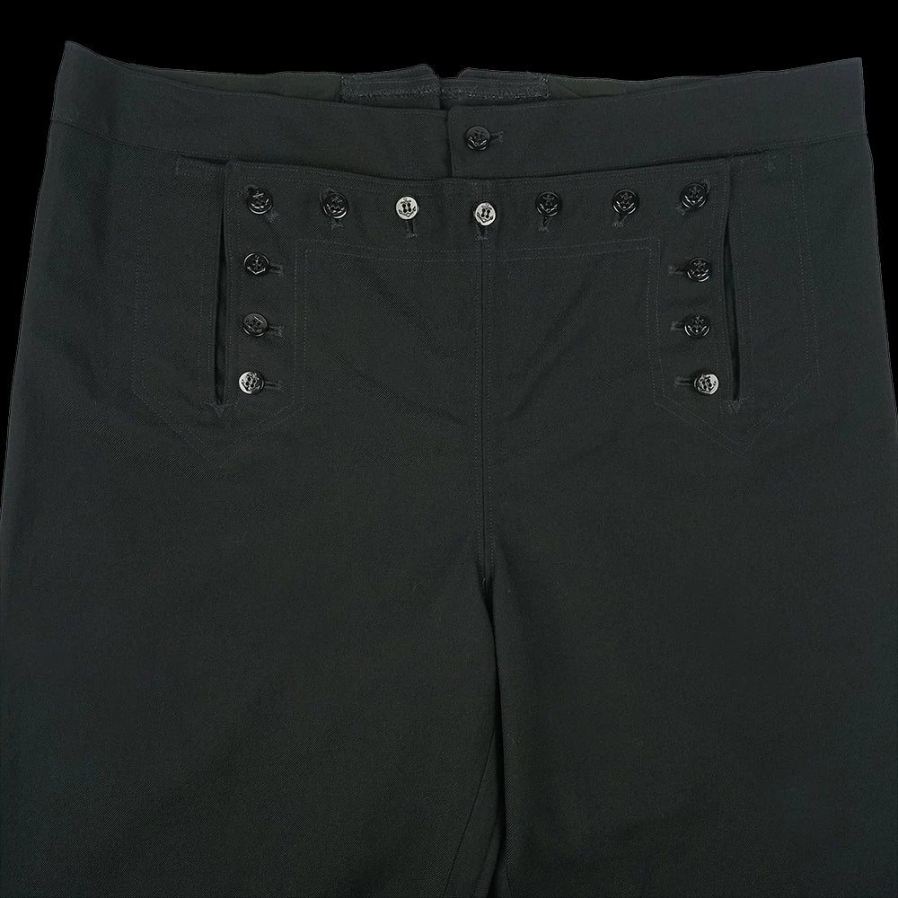 The more modern (but still without a zip!) classic piece of US Navy attire, the black 13 button broadfall flap trousers, also known as ''cracker Jack'' pants and were part of the uniform for colder months or Service Dress. Made with black twill wool, these high waisted trousers have less flare to the leg cut than in the past and are also lighter in weight than the felted wool version. The front fastening may take some getting used to but you'll soon be converted! Classic naval attire - perfect for collectors, vintage aficionados and fans of fancy pants.