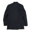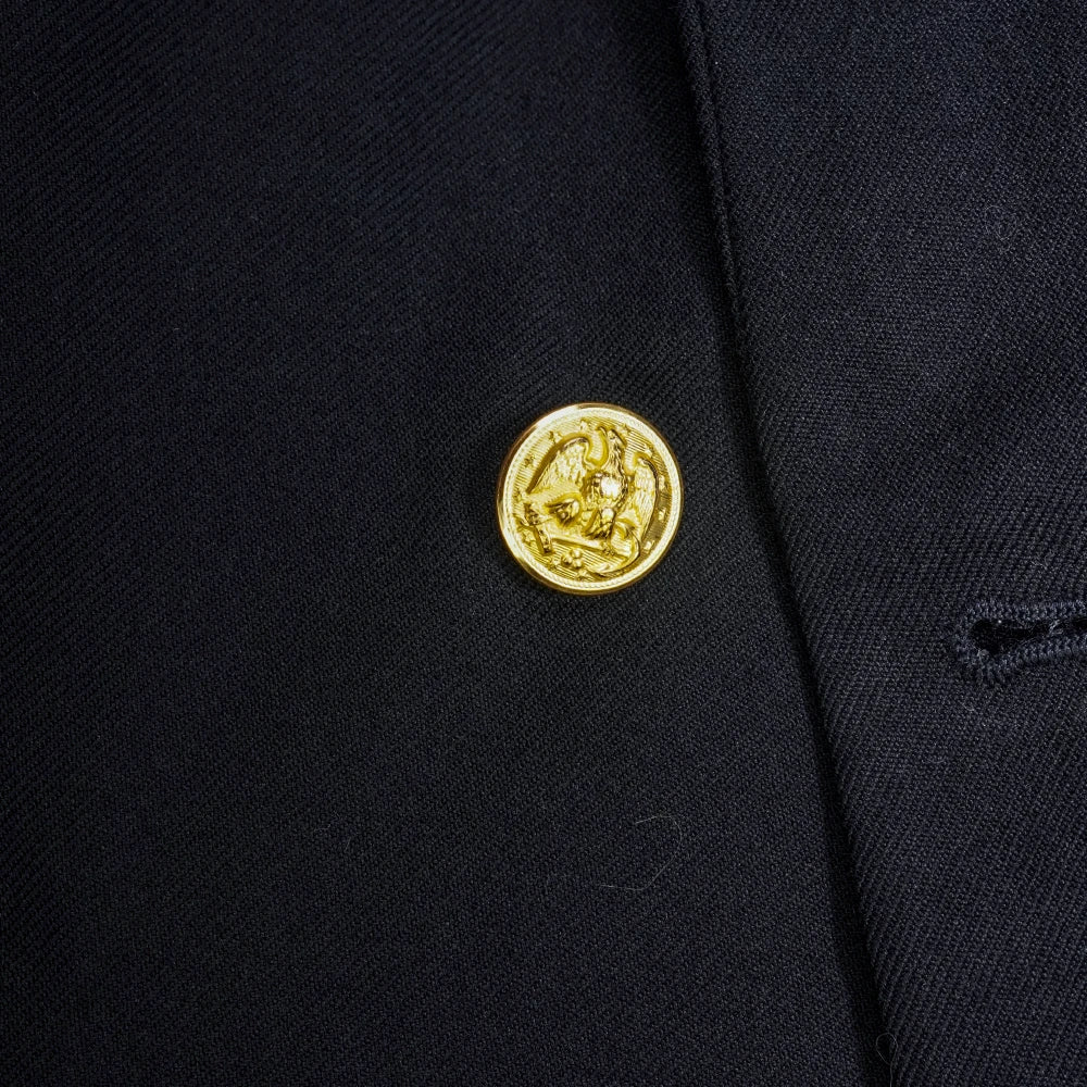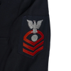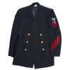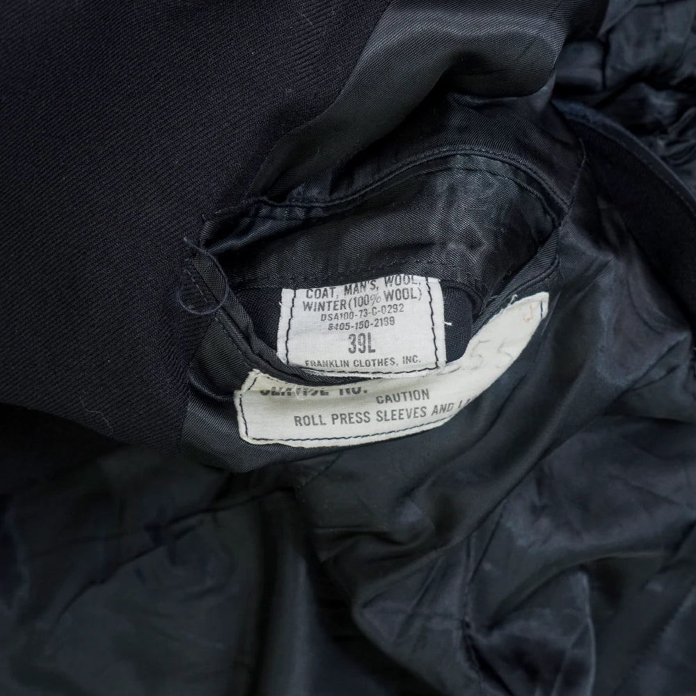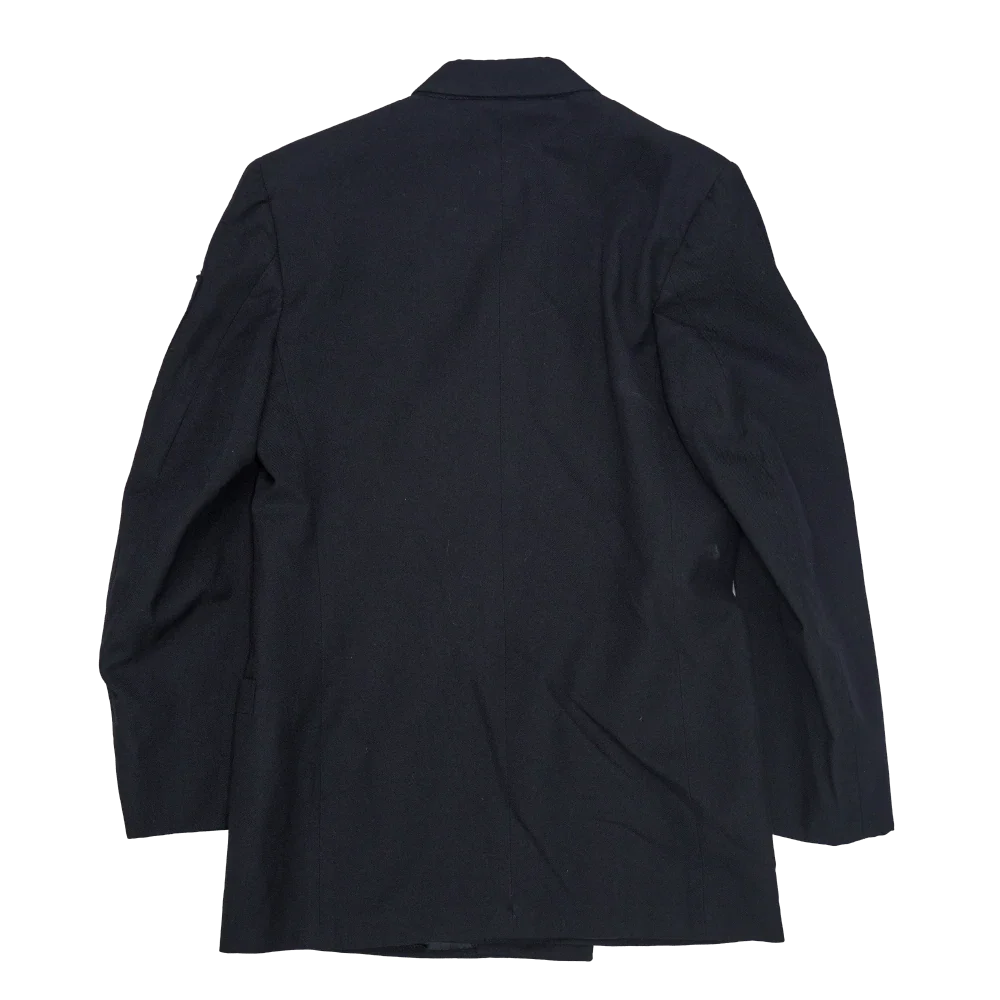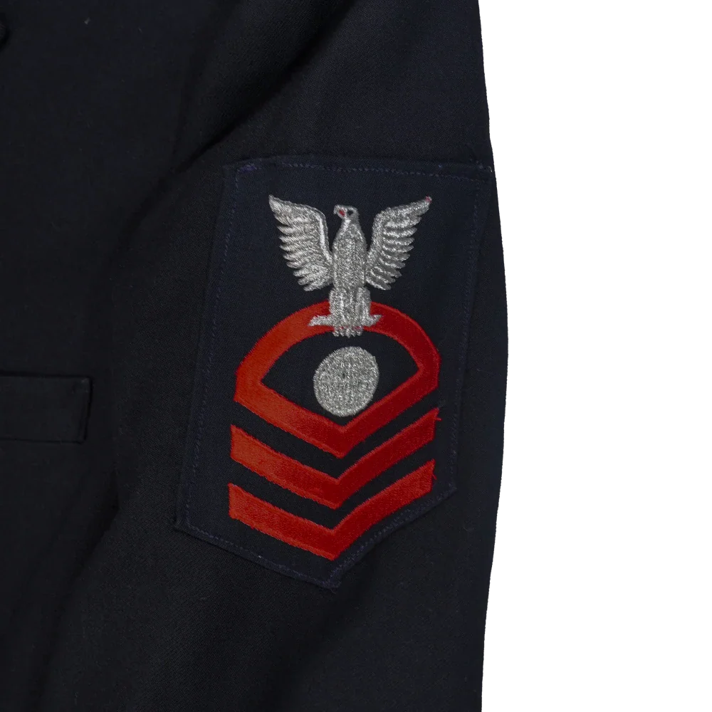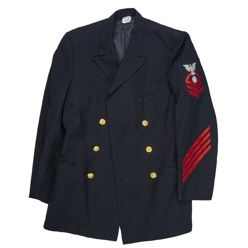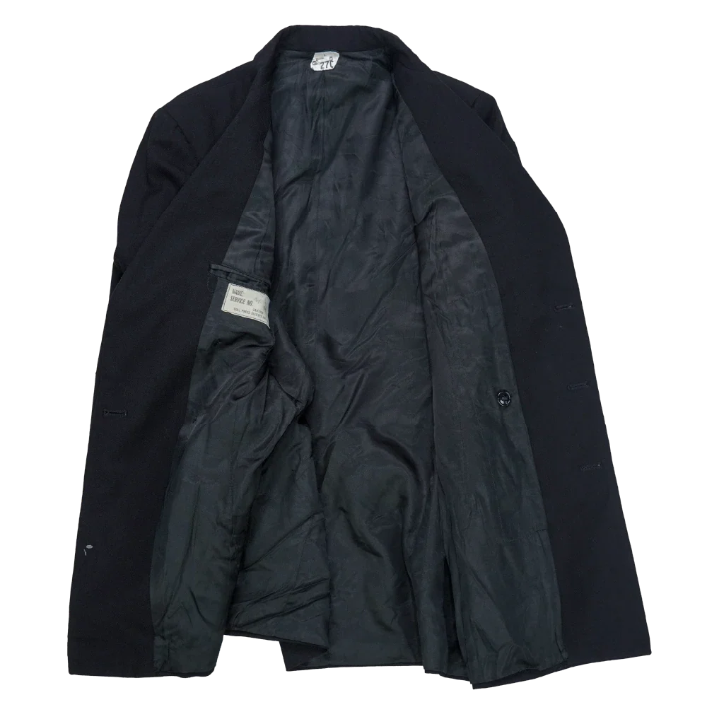 US Navy service dress jacket in a dark navy finish with a structured, formal cut. Features a double-breasted front with brass buttons, internal lining, and sleeve insignia patches.