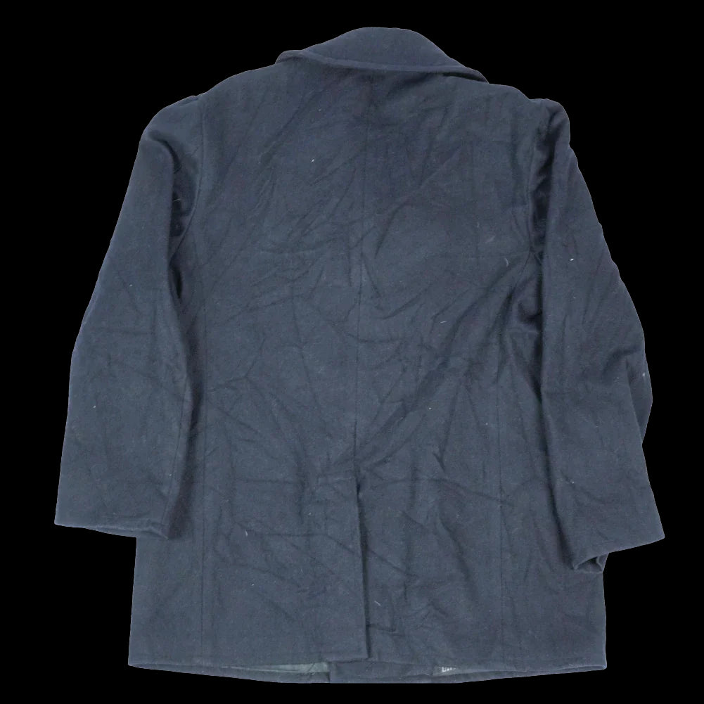 US Navy wool pea coat with a traditional double-breasted design. The coat features metal buttons with US Navy insignia, hip pockets, and two internal pockets.