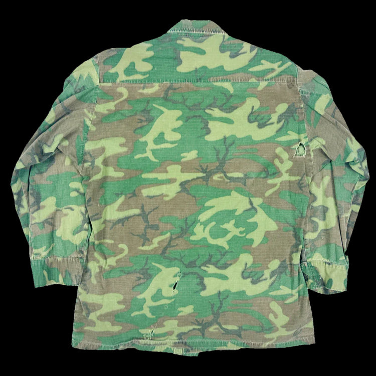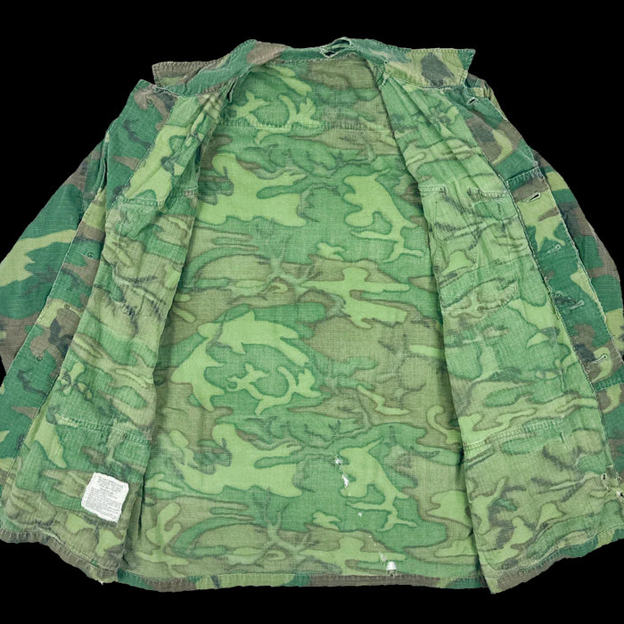 Vietnam era US ERDL jungle shirt manufactured in 1968. This is a ripstop field shirt with a four pocket front and button adjustable cuffs.