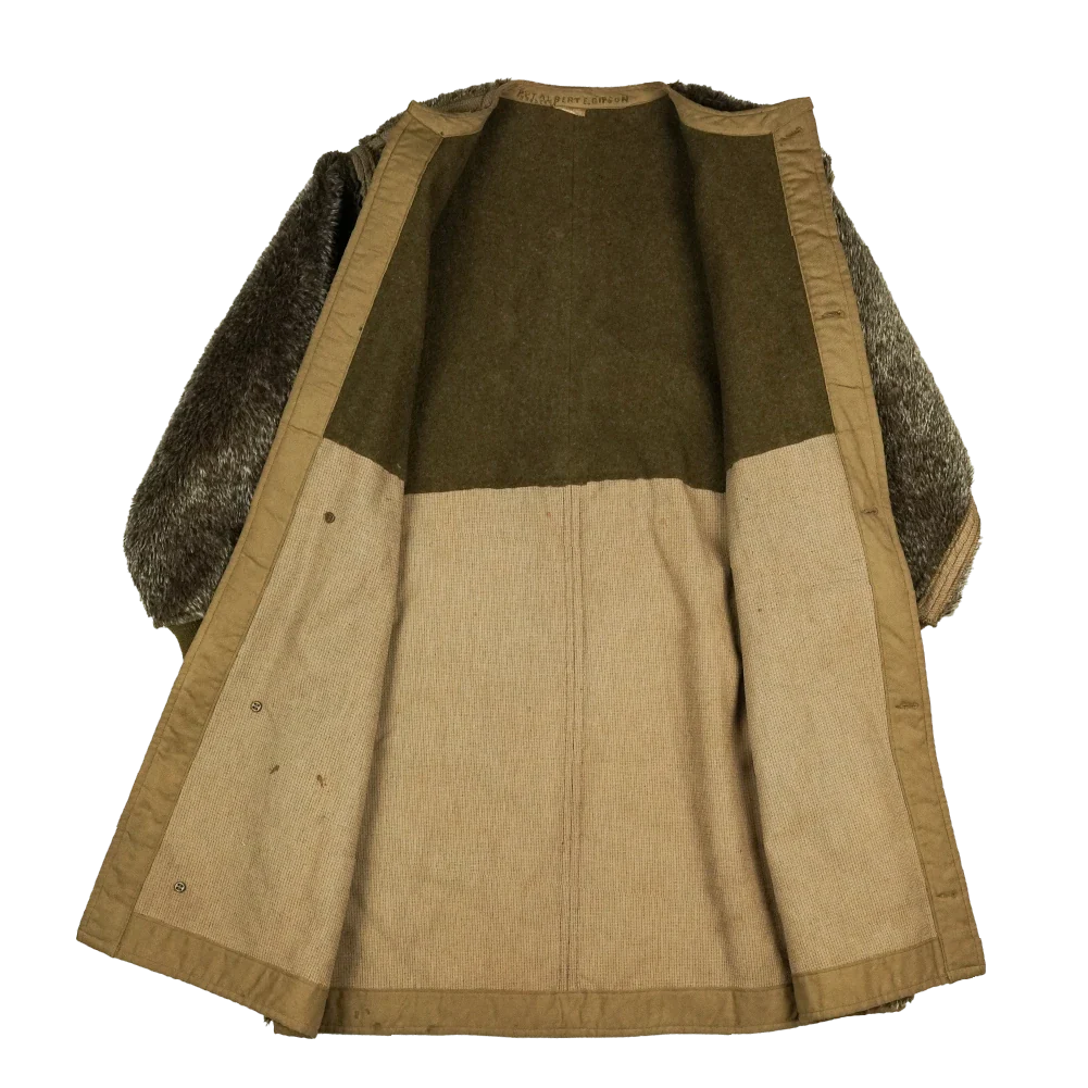 Features a thick alpaca wool pile lining typical of period cold-weather liners.