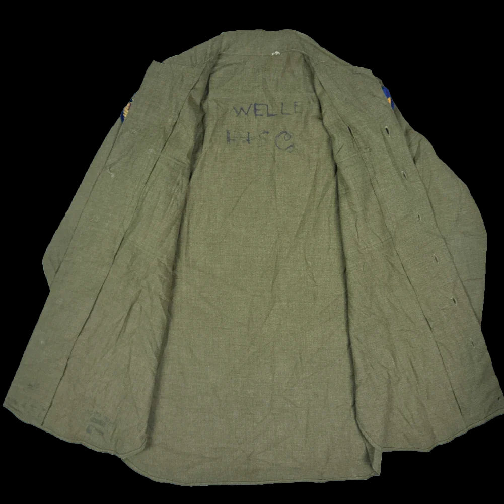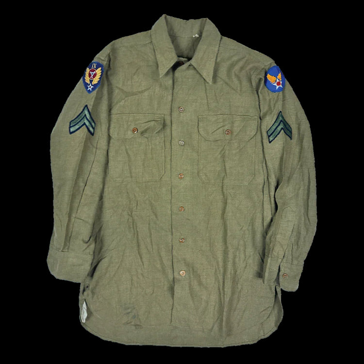 Part of the US standard field uniform at the break of World War 2, these continued to see service throughout the conflict. Features US Army Air Force, 9th Engineers Tactical Command and corporal rank insignia.