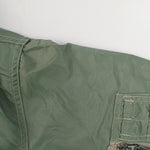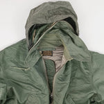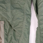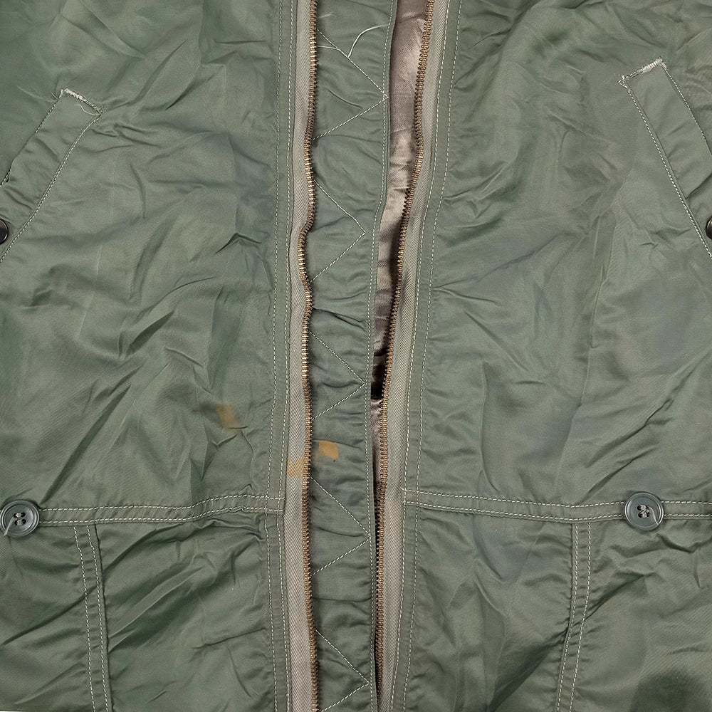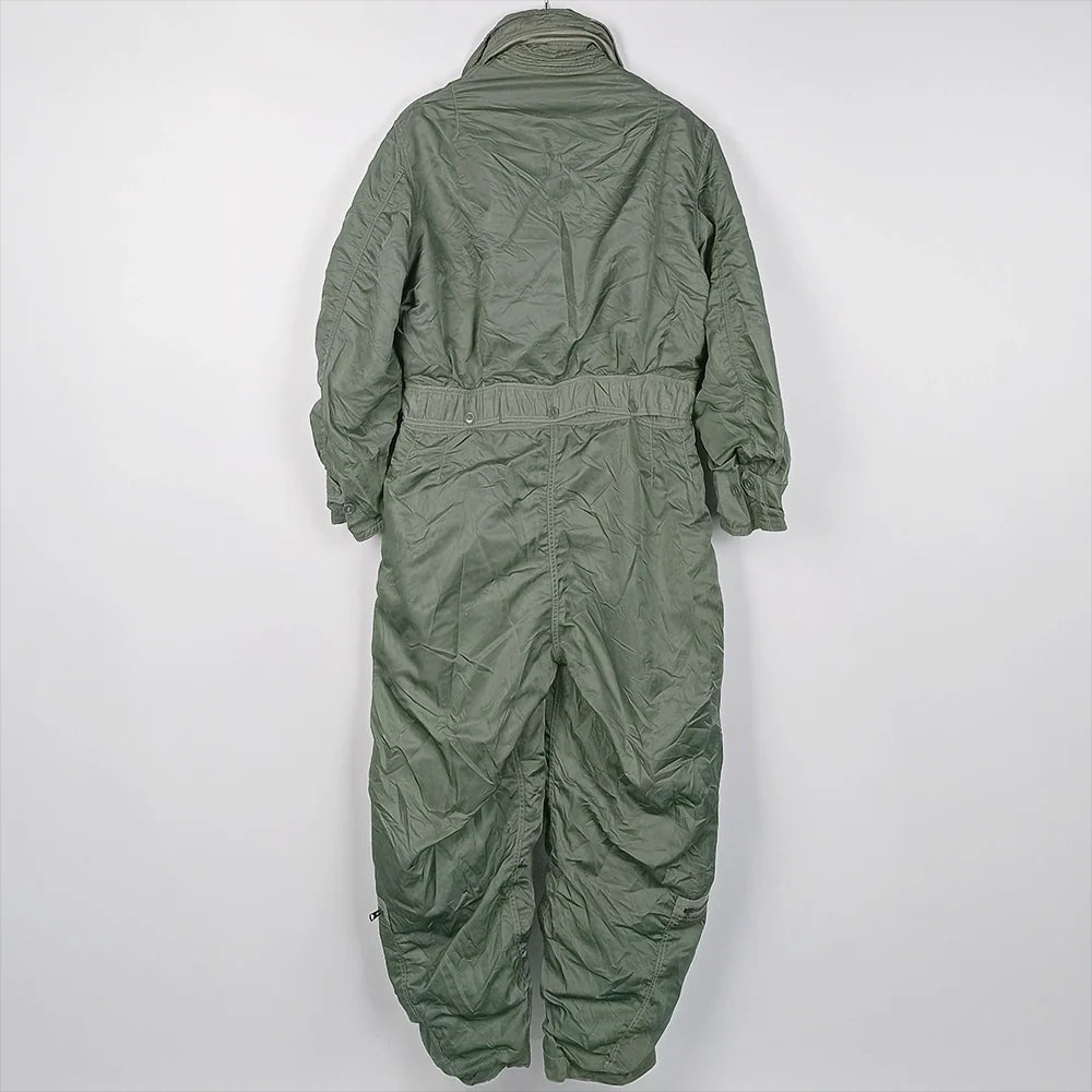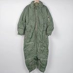 US Air Force insulated CWU-1/P coveralls, uncommon in larger sizes. Stowable hood and adjustable waist. High wear seams in good condition (arm pits, crotch, rear). Small white marks scattered to exterior. Faded stamp to mid back.