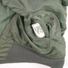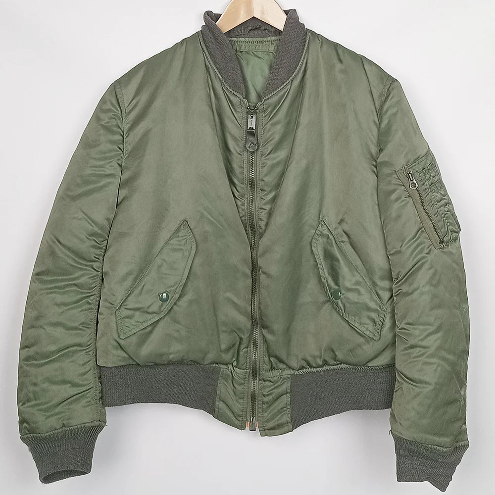 First issued in the early 1950s, the USAF MA-1 Intermediate Jacket replaced bulky leather flight jackets for improved mobility in jet cockpits. Constructed from water-resistant nylon with polyester filling, it was lightweight yet warm. Worn throughout the Korean and Vietnam Wars, the MA-1 became standard for U.S. aircrews and later a global fashion staple, prized for its rugged functionality and classic military design. This jacket (and the other for sale) do not have the reversible orange lining but subdued sage green, like the exterior. This jacket and the other are from 1987. This jacket is in very tidy condition except for the knit inner neck, where the fabric has come away from the bottom edge (the outer side is still intact) and small hole to the right knit cuff. Very light scuffs to the outer fabric and faint white marks down the left sleeve.