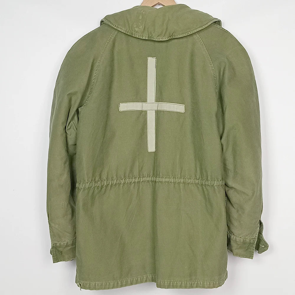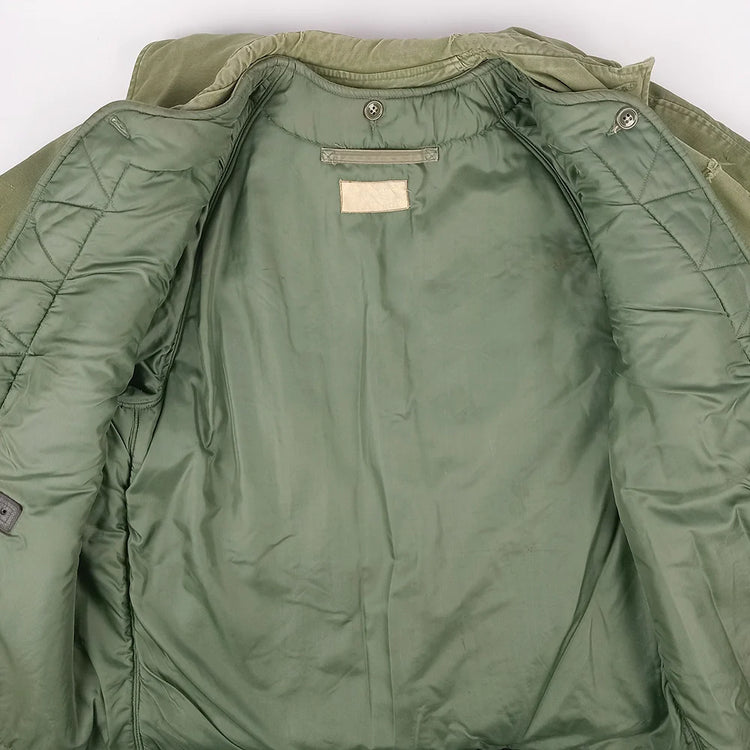 Modified for better visibility in the US Air Force, this jacket's design is somewhere between the M-65 and older M-43. Like the M-43, these are front button fastening and like the M-65, these have a stowable hood in the oversized ''dumbo'' collar.