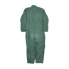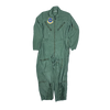 Surplus USGI flying coveralls in OG107, featuring a zip front closure with multiple utility pockets across the chest, waist, thighs, lower legs, and an upper left sleeve. Manufactured in 1967, with domed waist adjusters and a noted large repair on the lower backside.