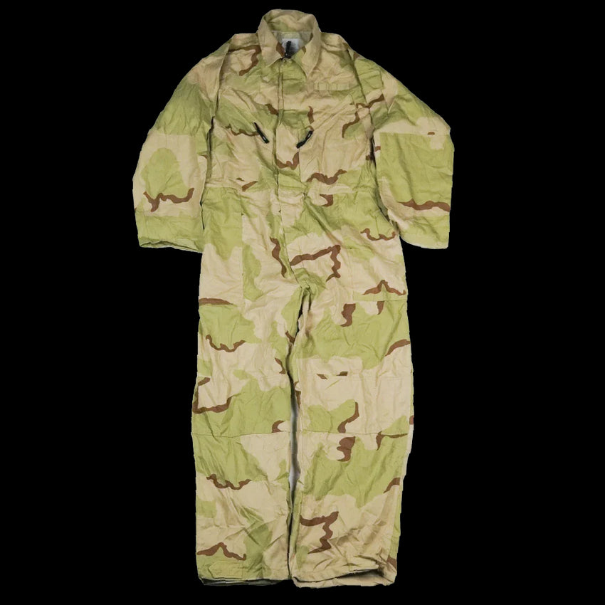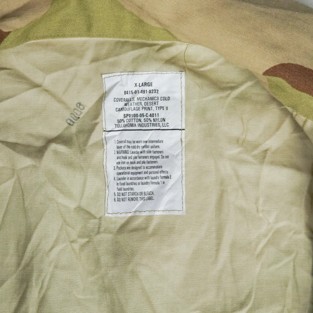 USGI cold weather mechanics coveralls in the 3 Colour Desert camouflage pattern. Manufactured in 2005. Full-body one-piece garment designed for cold weather use.