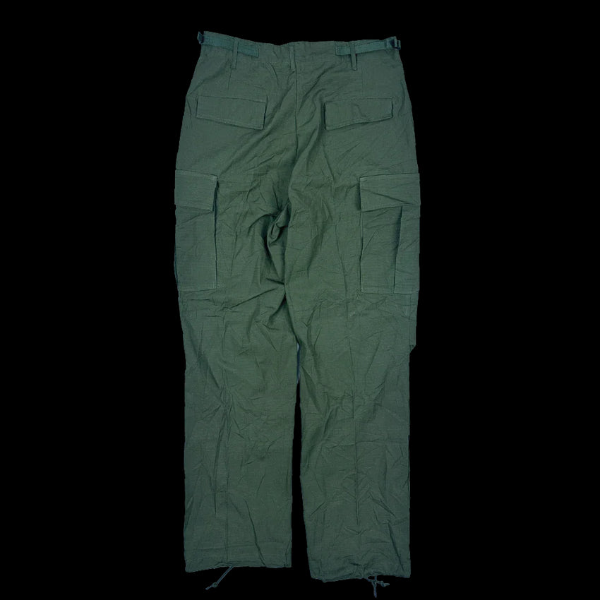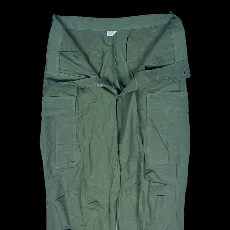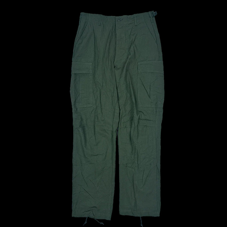 USGI 5th Pattern Jungle Fatigue Trousers in Medium Long size. Manufactured in 1967. Constructed from ripstop poplin cotton fabric with button-secured rear pockets and cargo leg pockets. The trousers feature adjustable waist straps and draw cords at the leg cuffs.