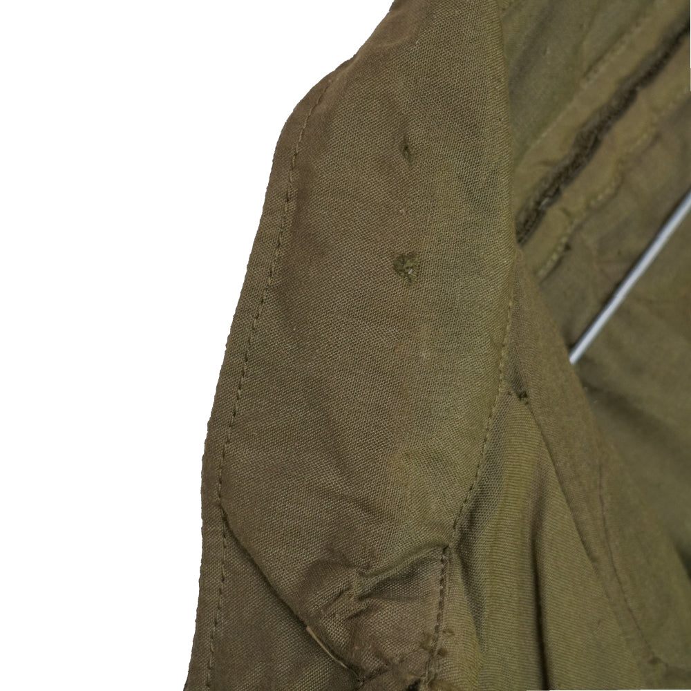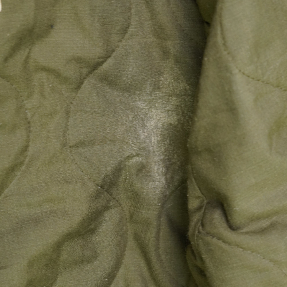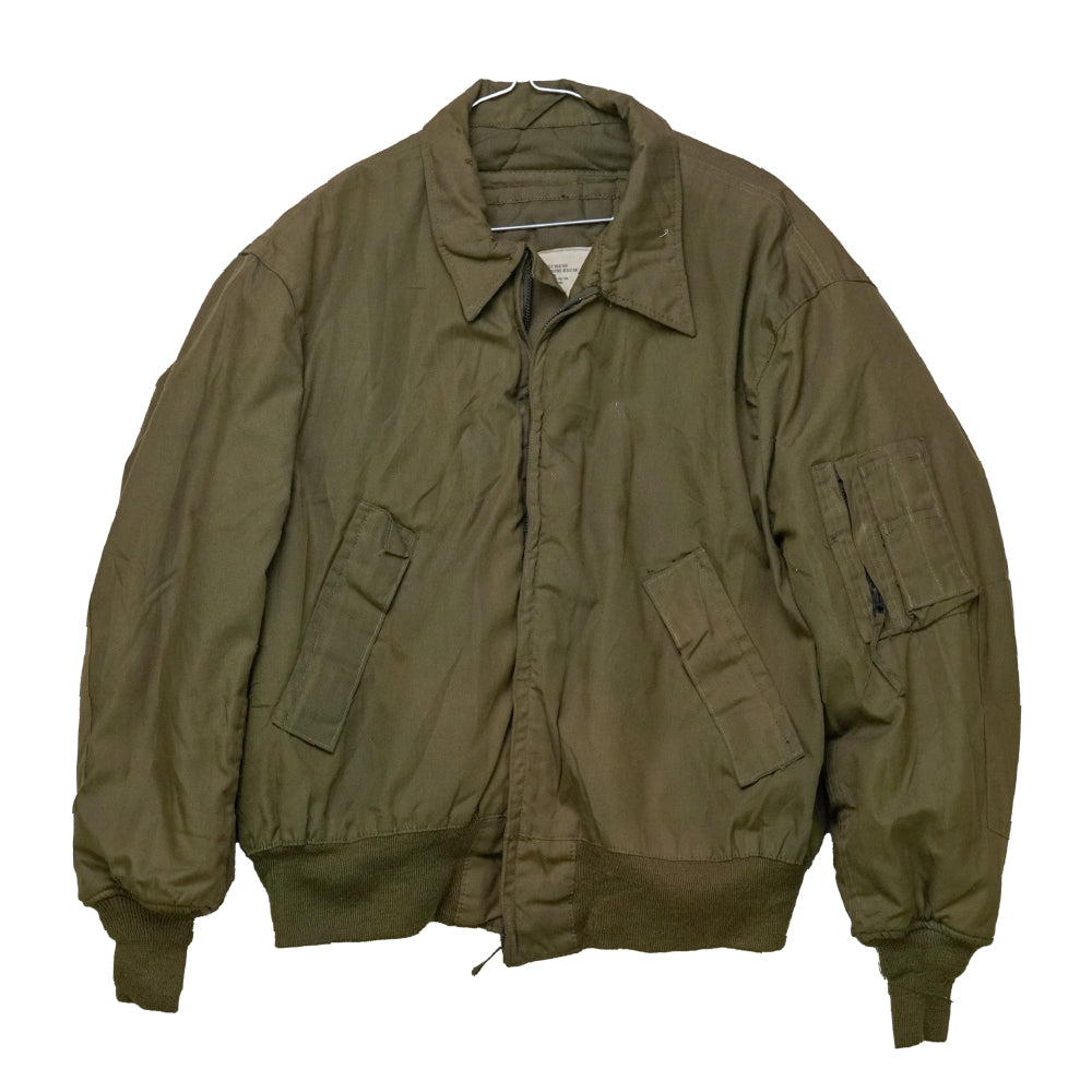 USGI CVC cold weather jacket in olive drab. Quilted insulated lining with a full front zip and storm flap. Rib-knit cuffs and waistband with a fold-down collar. Manufactured in 1980.