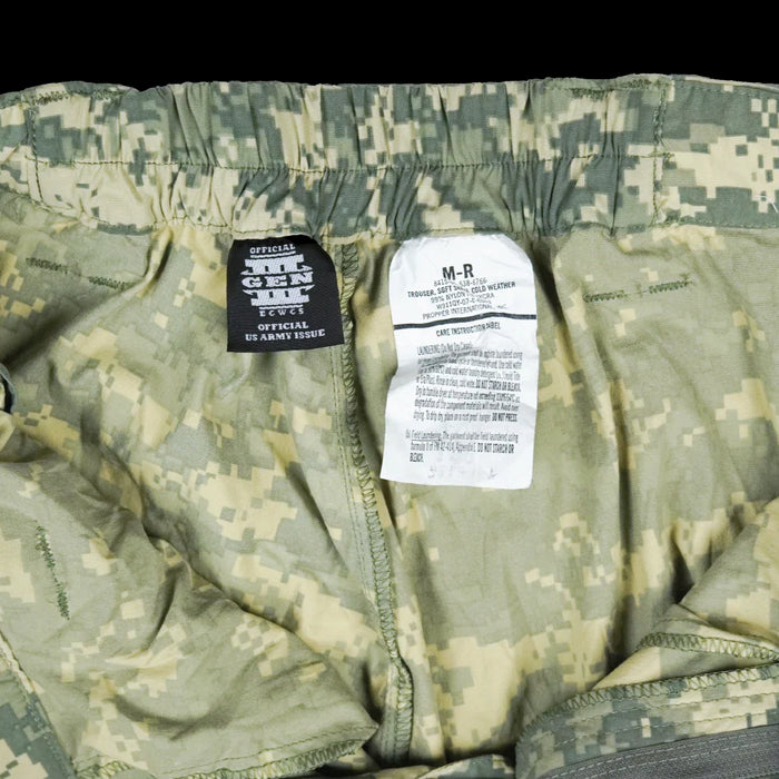 USGI ECWCS Generation III soft shell trousers in ACU pattern. Constructed as a soft shell layer with a water resistant fabric. Manufactured in 2007.