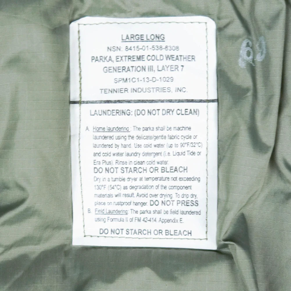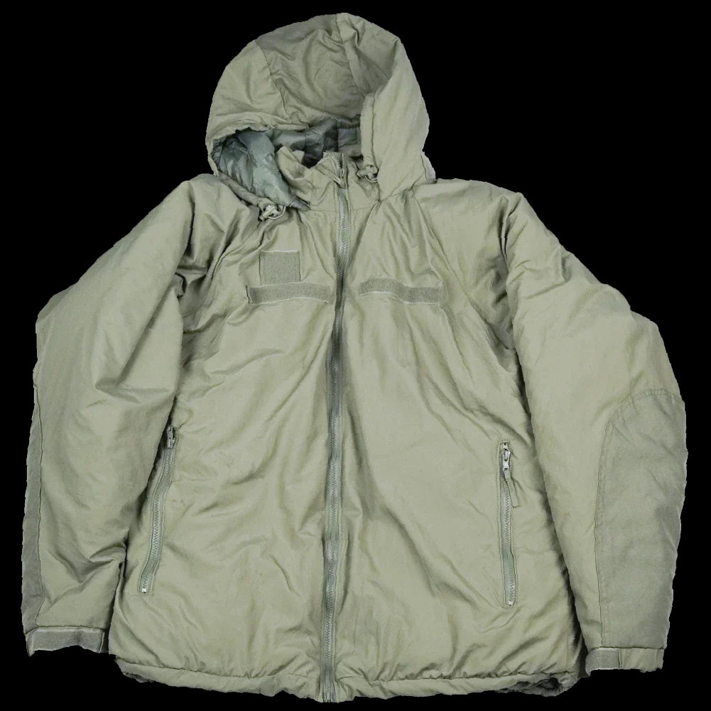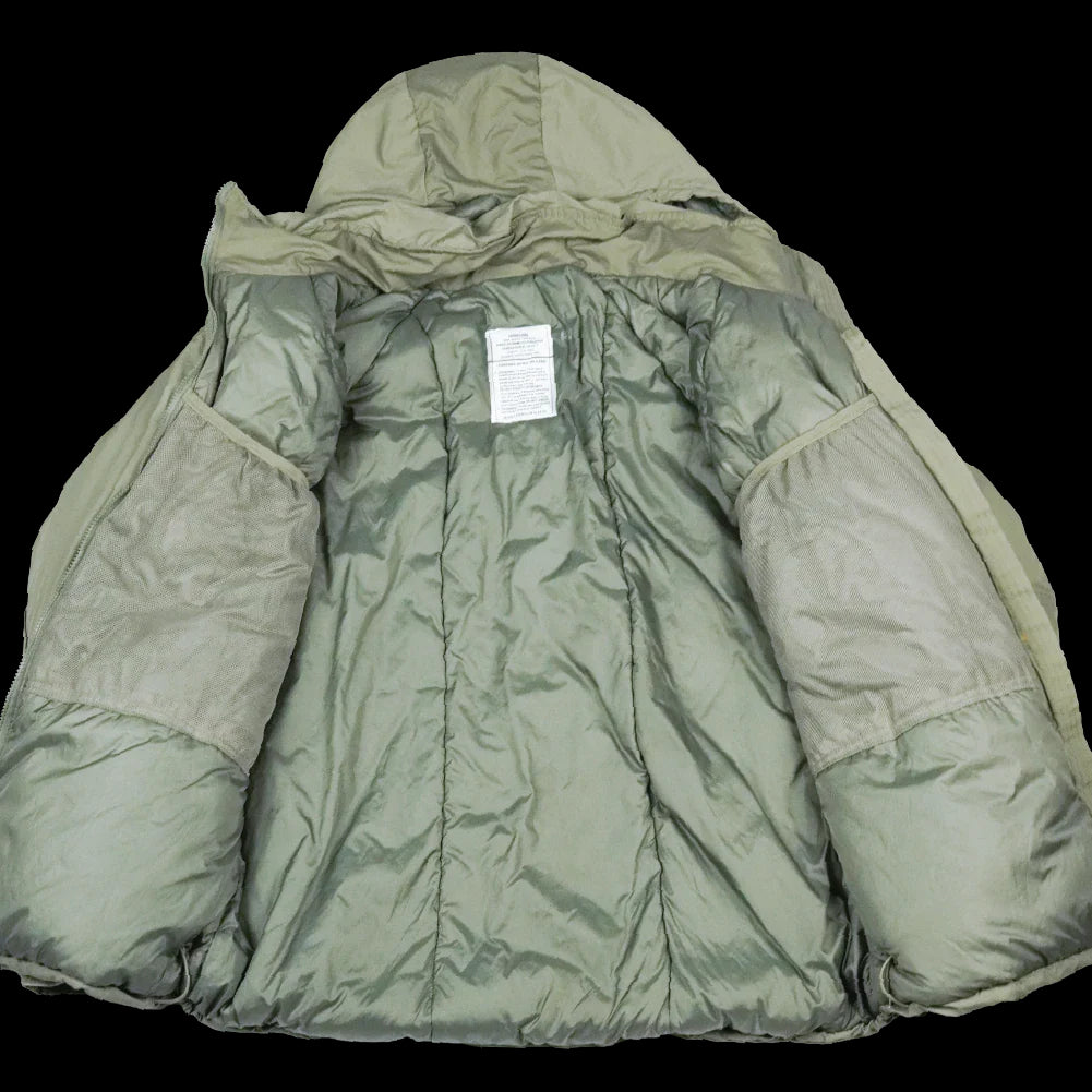 USGI ECWCS GEN III Level 7 insulated parka. This is a cold weather outer layer with a full-length design and integrated hood. Manufacture date is 2013.