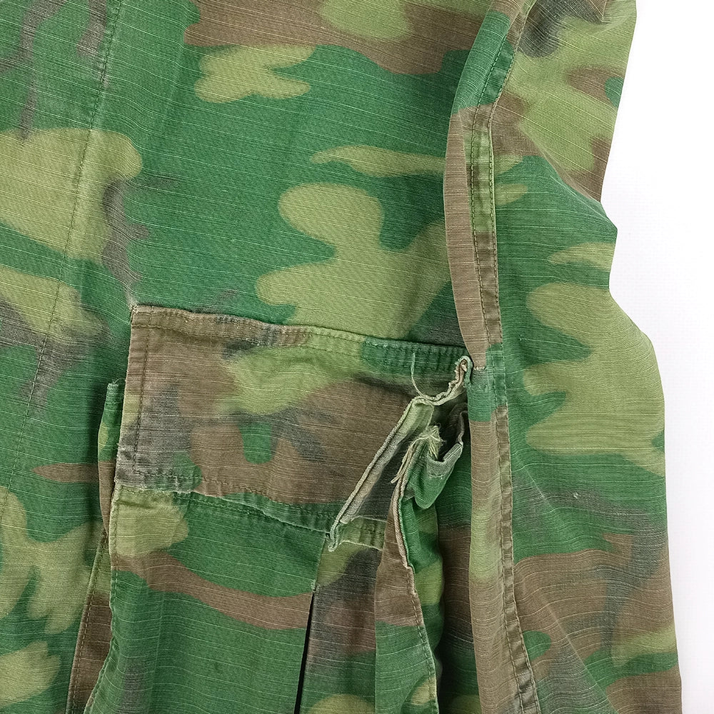 US issue slant pocket TCU ERDL jungle fatigue shirt. A nice example of green dominant ERDL with some damage but remains overall aesthetic and functional.