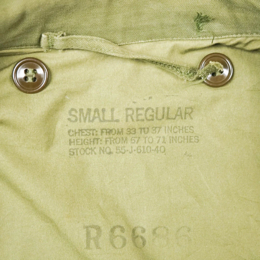 There is a small hole in the left front of the jacket. The left cuff button is missing and the right cuff button is broken. First introduced during the tail end of the Korean War, these were designed to replace the older M-1943 that were no longer fit for purpose in colder climates. This particular jacket is the Korean War model however has a subdued name and US Army tapes so likely saw use in the late 60s to 70s.