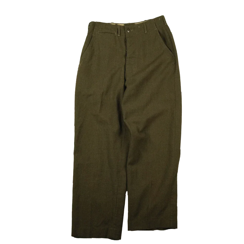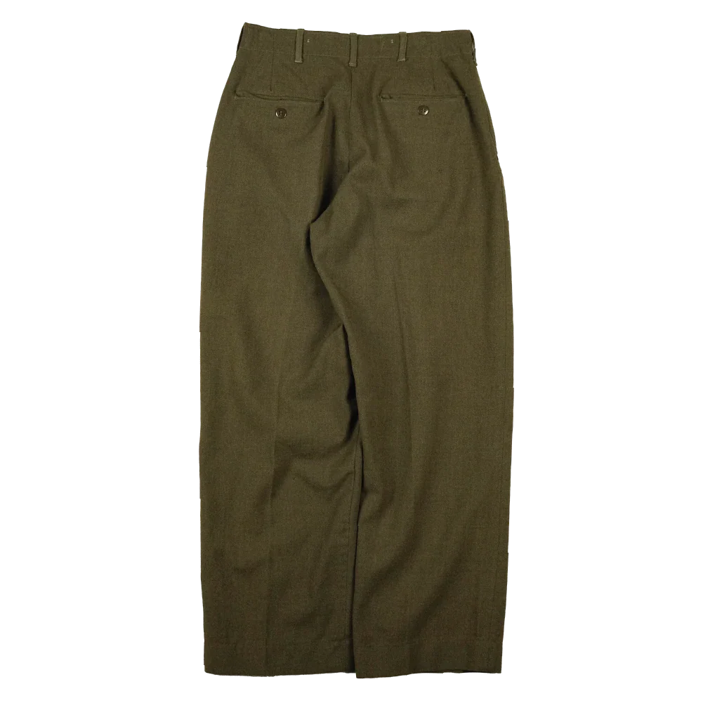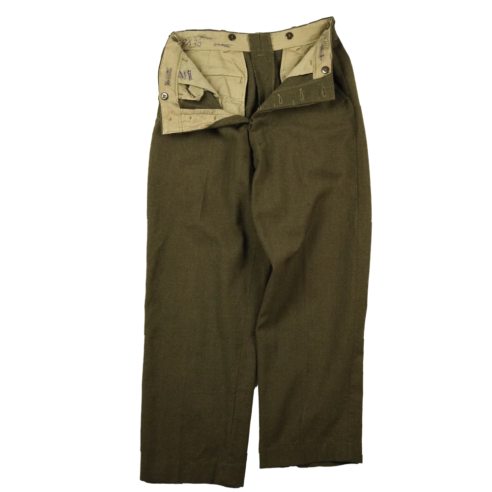 USGI M45 field trousers made from olive wool fabric. This is a military surplus example in Used/Good condition with standard field construction.