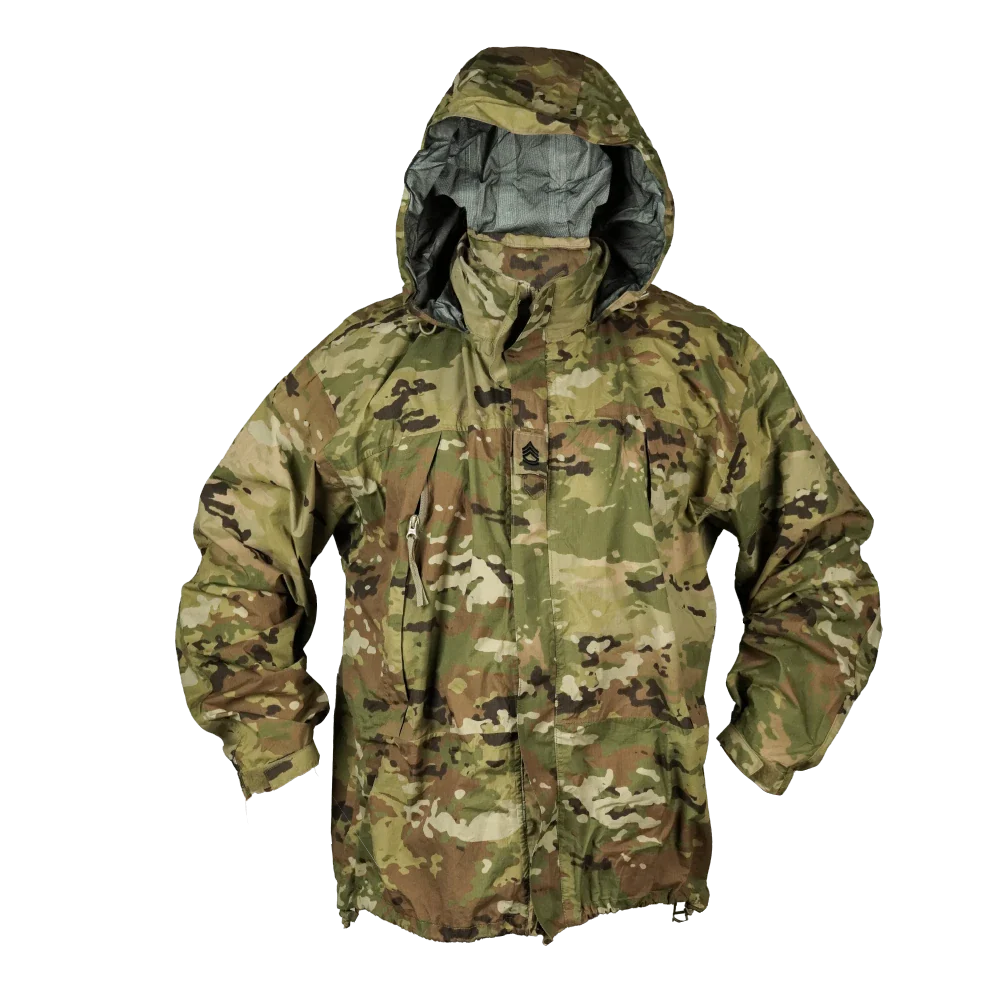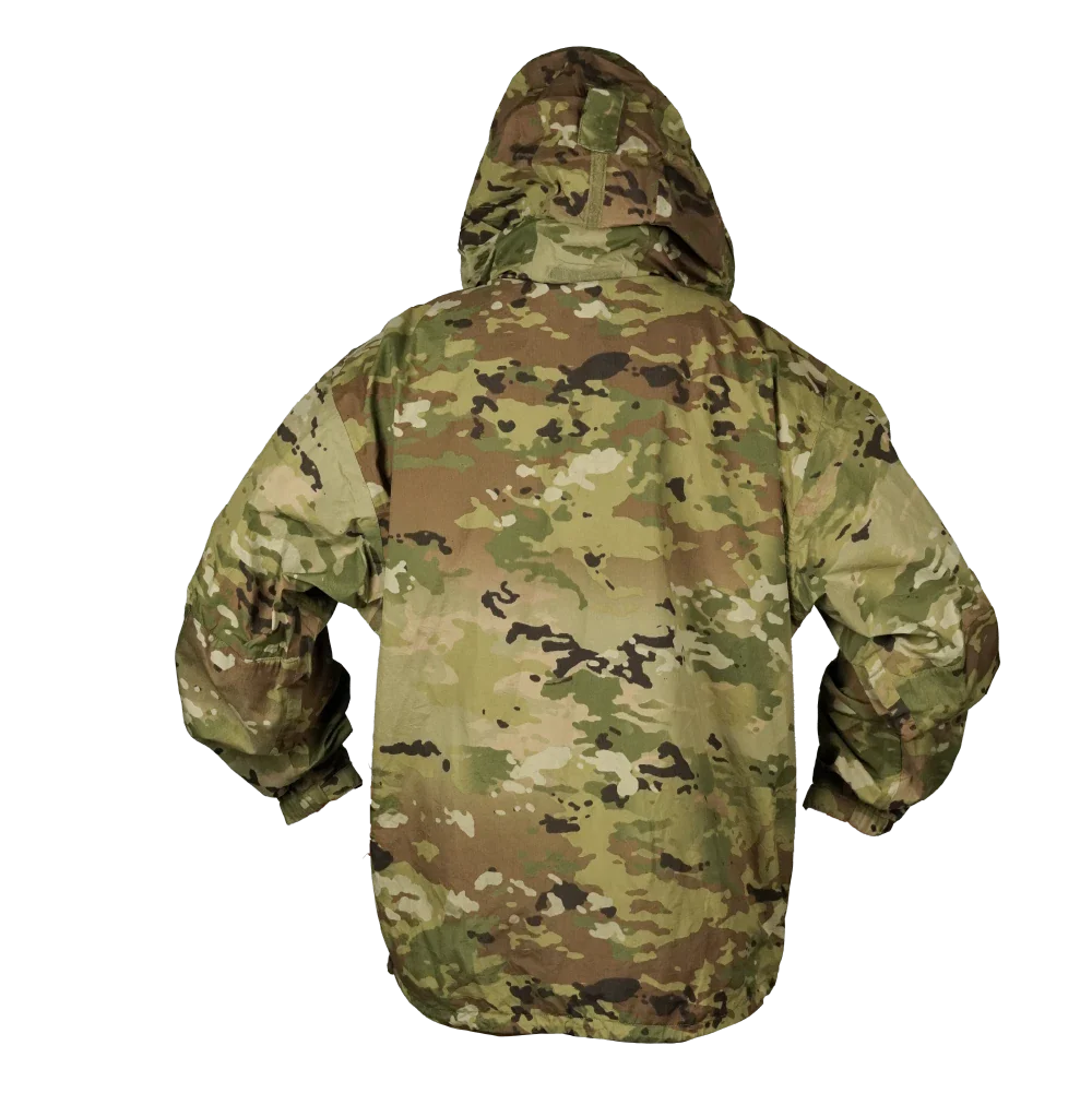 U.S. Government Issue ECWCS Gen III Layer 6 jacket in Operational Camouflage Pattern (OCP). This is a lightweight waterproof outer shell with a full front zip and storm flap, a high stand-up collar, and adjustment at the cuffs and hem.