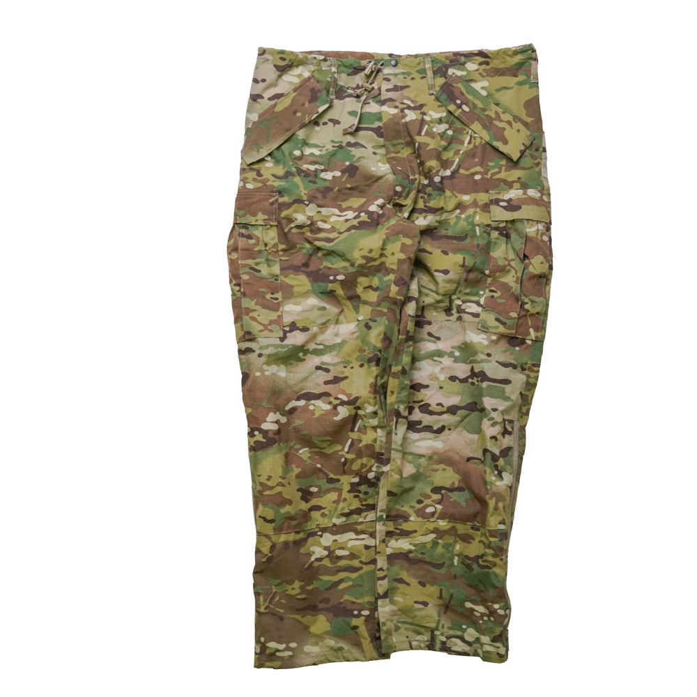 USGI OCP Gore-Tex APEC wet weather trousers in OCP camouflage pattern. Waterproof outer shell with full-length side zips for access and ventilation. Manufactured in 2016.