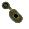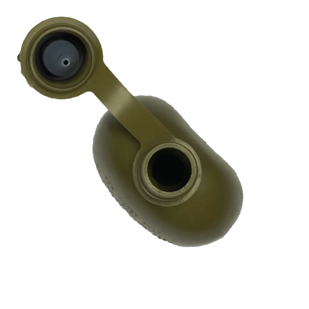 Not only is this sturdy one quart (~0.946 L) US olive canteen handy for transporting water, the top to these is a M1 Nuclear, Biological, Chemical (NBC) cap! These caps are sealed, valved and couple with a drinking hose attachment on NATO standard military gas masks. So there was no need to decontaminate for a sip, simply flip open the valve covering and slot on in to your handy canteen. The whole cap also fits on other NATO standard 28mm military canteens - if you happen to be extra thirsty it's possible to transfer the cap to the two quart. Maybe you don't need to wear your gas mask and have no need for the adaptor? No problem! The valve cap ensemble unscrews as a lid and voila, canteen contents access.
