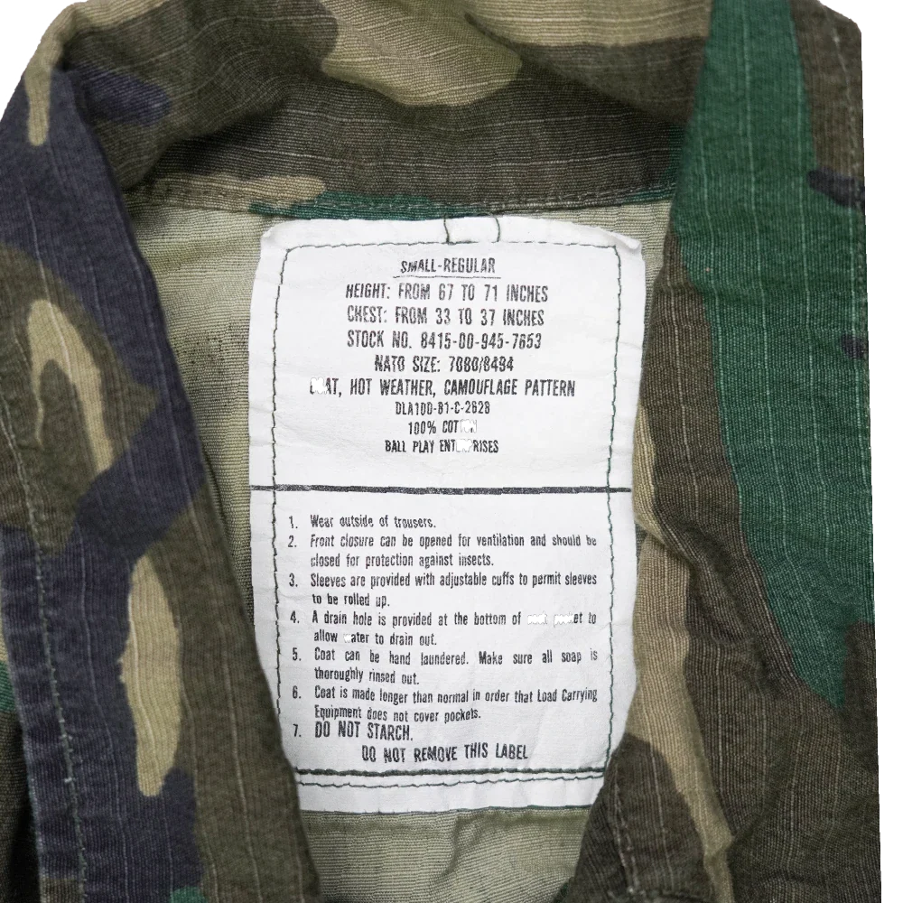 USGI RDF ERDL ripstop shirt in surplus condition. Lightweight ripstop construction with a standard button-front closure and chest storage.