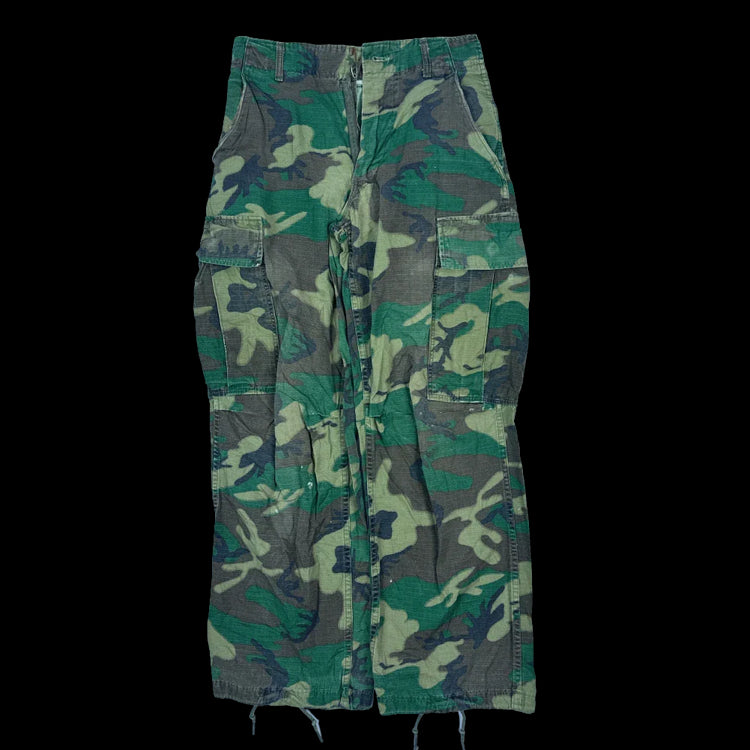 USGI RDF ERDL Ripstop Trousers in ERDL camouflage in XSmall Short size. These trousers are made in ripstop fabric with camouflage pattern throughout. They are in used condition with value grade.