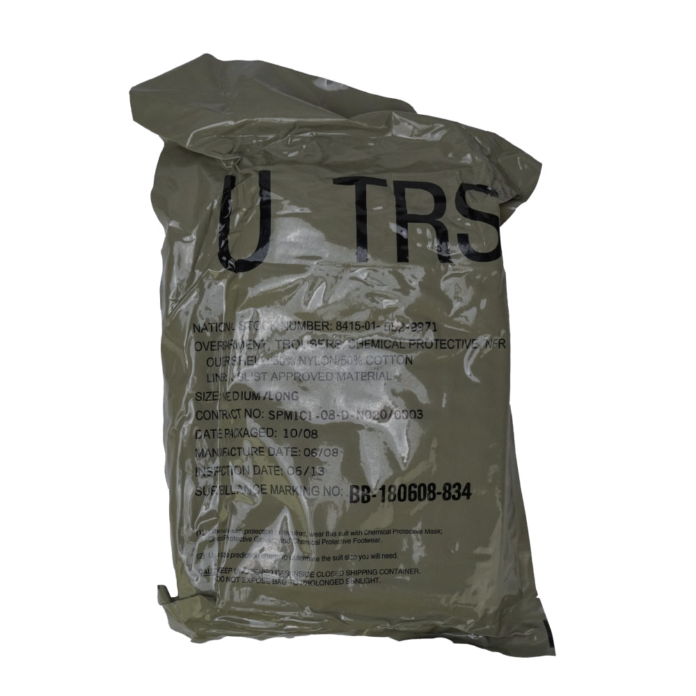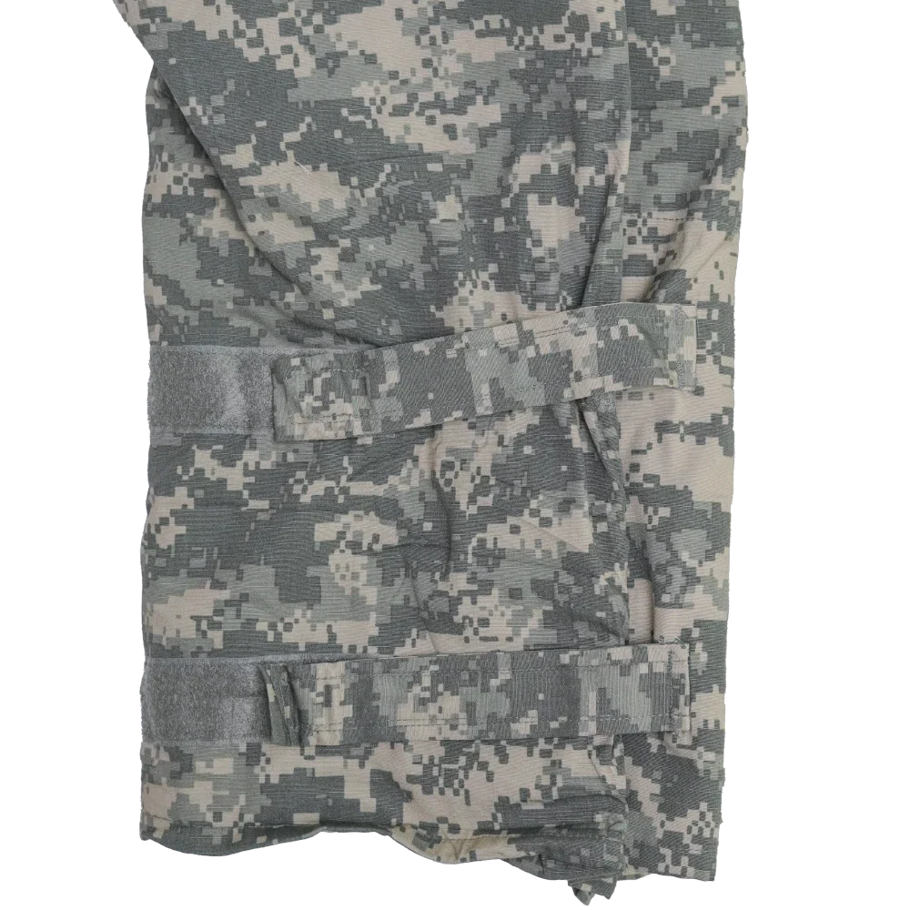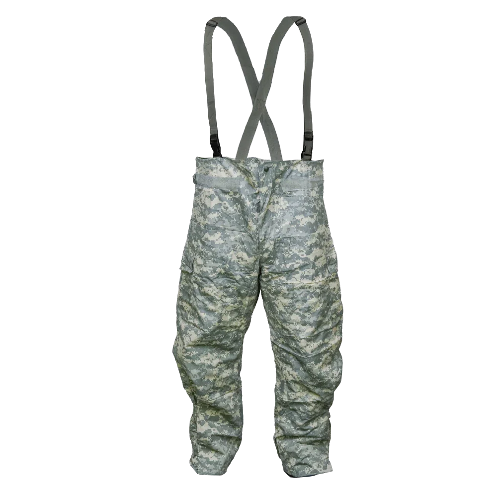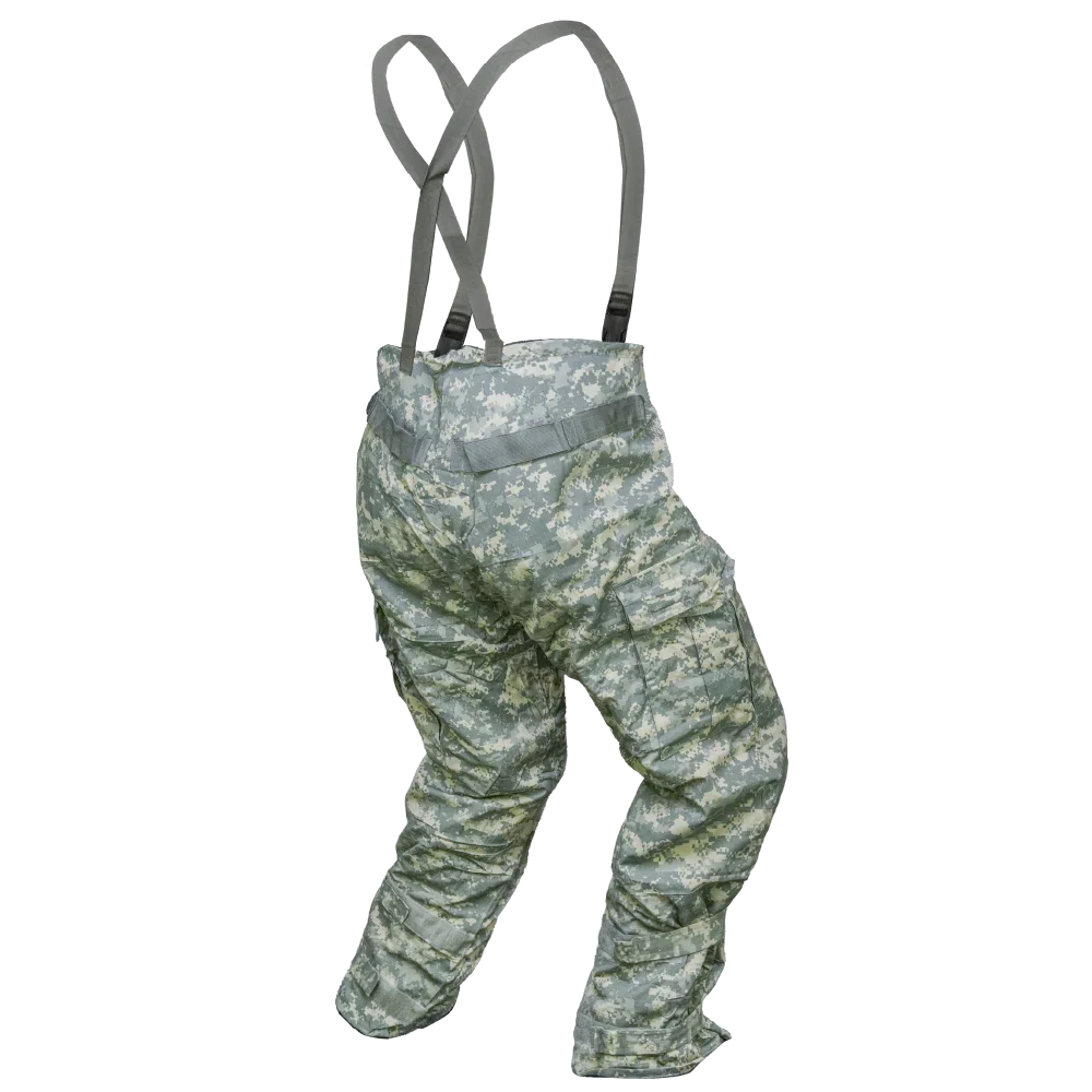 USGI UCP NBC Trousers in UCP digital camouflage. Constructed from a 50% nylon / 50% cotton outer shell with a protective liner. Designed as an overgarment with integrated adjustable suspenders, waist adjustment tabs, cargo pockets, and adjustable ankle closures.