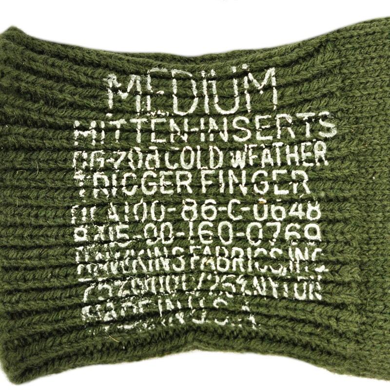 Insert your cold hands into a pair of woolen mitten inserts, fresh from the US Army. These are intended to slide into a pair of leather trigger finger mittens for operating in cold weather. By themselves, the inserts provide an insulating layer for use in mild conditions. The thumb and index finger are separated to offer more dexterity for pulling triggers and other precise finger motions. When such dexterity is not needed, you can scooch your index and thumb into the rest of the mitten to embrace the full warmth of your fellow fingers.