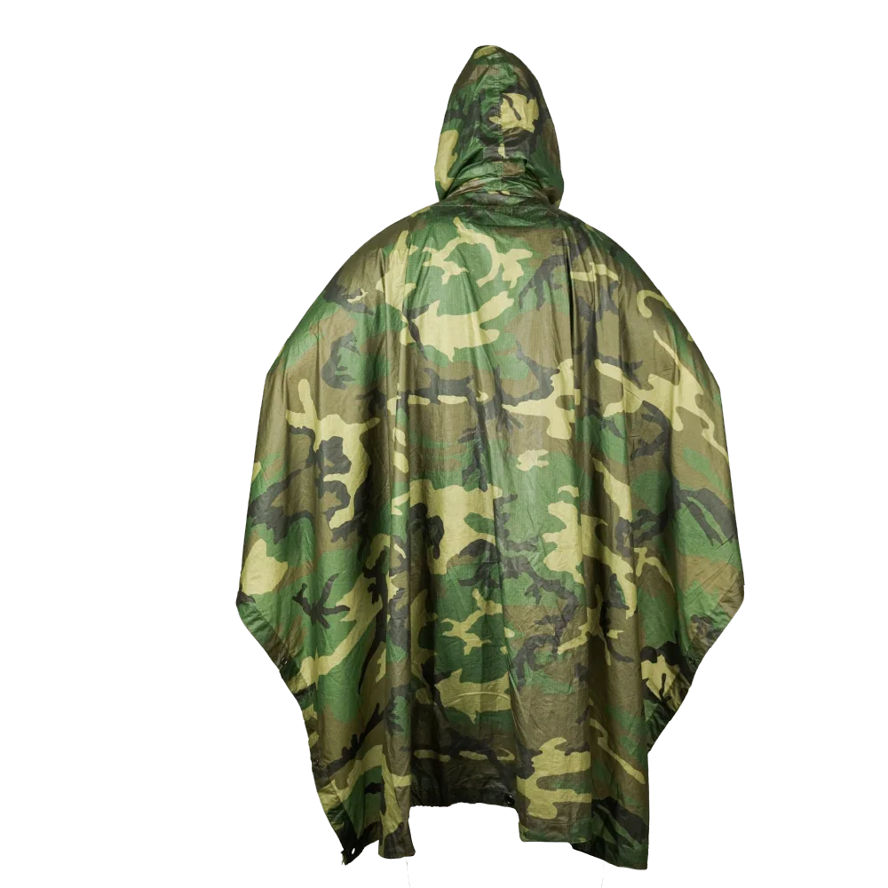 U.S. Government Issue woodland camouflage poncho produced to U.S. military specifications. Lightweight construction with an integrated hood and water-resistant material.