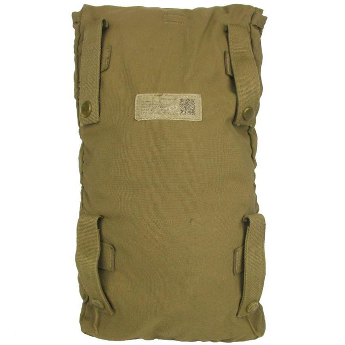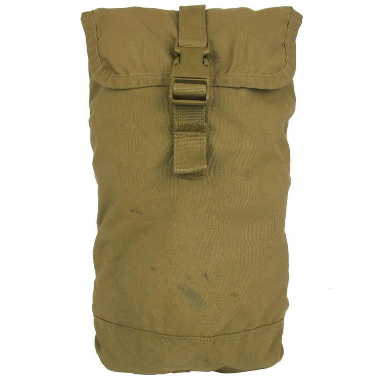 The pouch is secured to a PALS surface with 4 MOLLE tabs that have snap domes. To add your hydration bladder (not included) there is a plastic clip and adjustable strap you simply open at the top of the pouch. Inside there is a cord loop you can feed the drinking tube through so the bladder doesn't slouch. If you happen to not secure the lid on your bladder correctly or get a leak, the pouch has a large drain hole to release the build up of water. Made from a hard wearing cordura finished in coyote brown, these have plenty of life left in them and will protect your hydration bladder well.