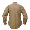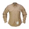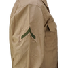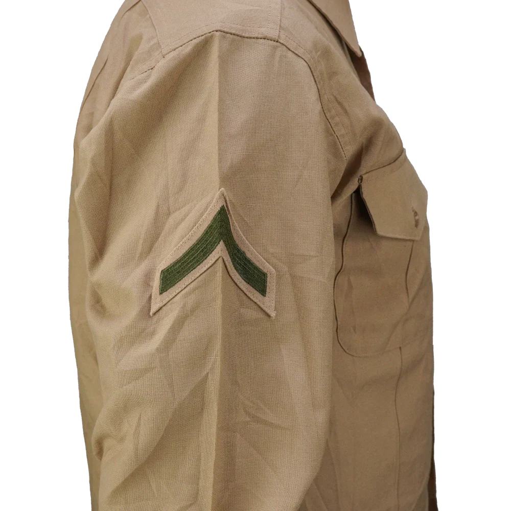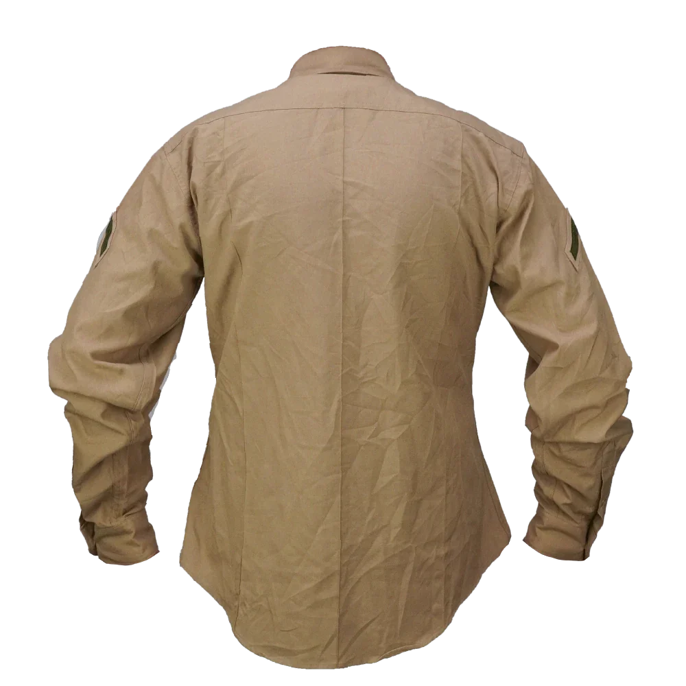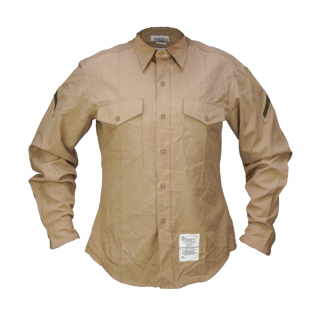 US Marines/Navy khaki service dress shirt in a poly/cotton blend. Long sleeve shirt with a structured collar, full button front, and dual chest pockets with buttoned flap closures. Shoulder epaulettes are present for insignia attachment, and some shirts may include sewn rank patches on the sleeves. Shirts will be randomly picked.