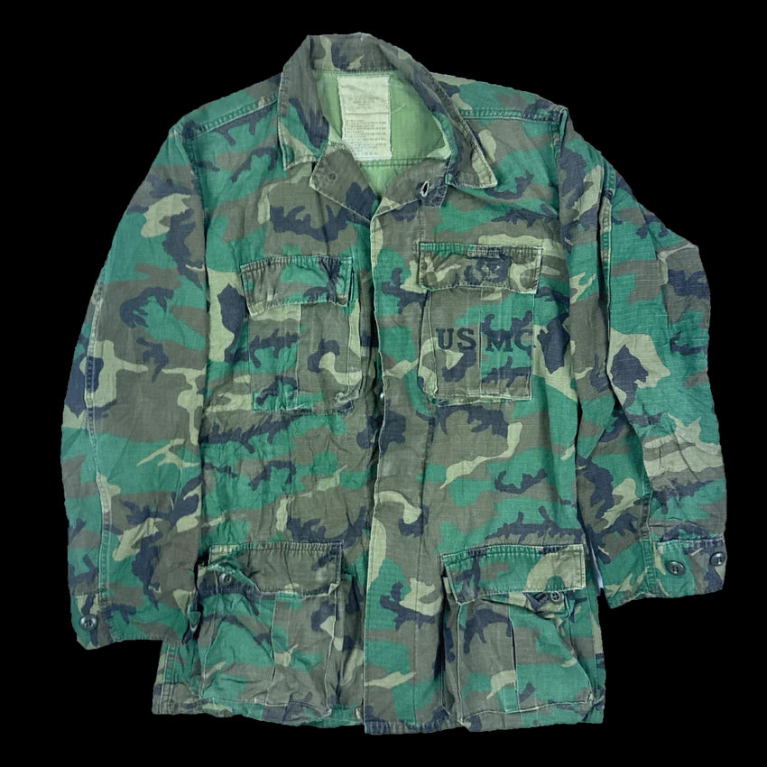 USMC RDF ERDL ripstop shirt with four-pocket front and button-adjustable cuffs. Constructed in a ripstop fabric and marked with USMC pocket insignia. Manufacture date is 1980.