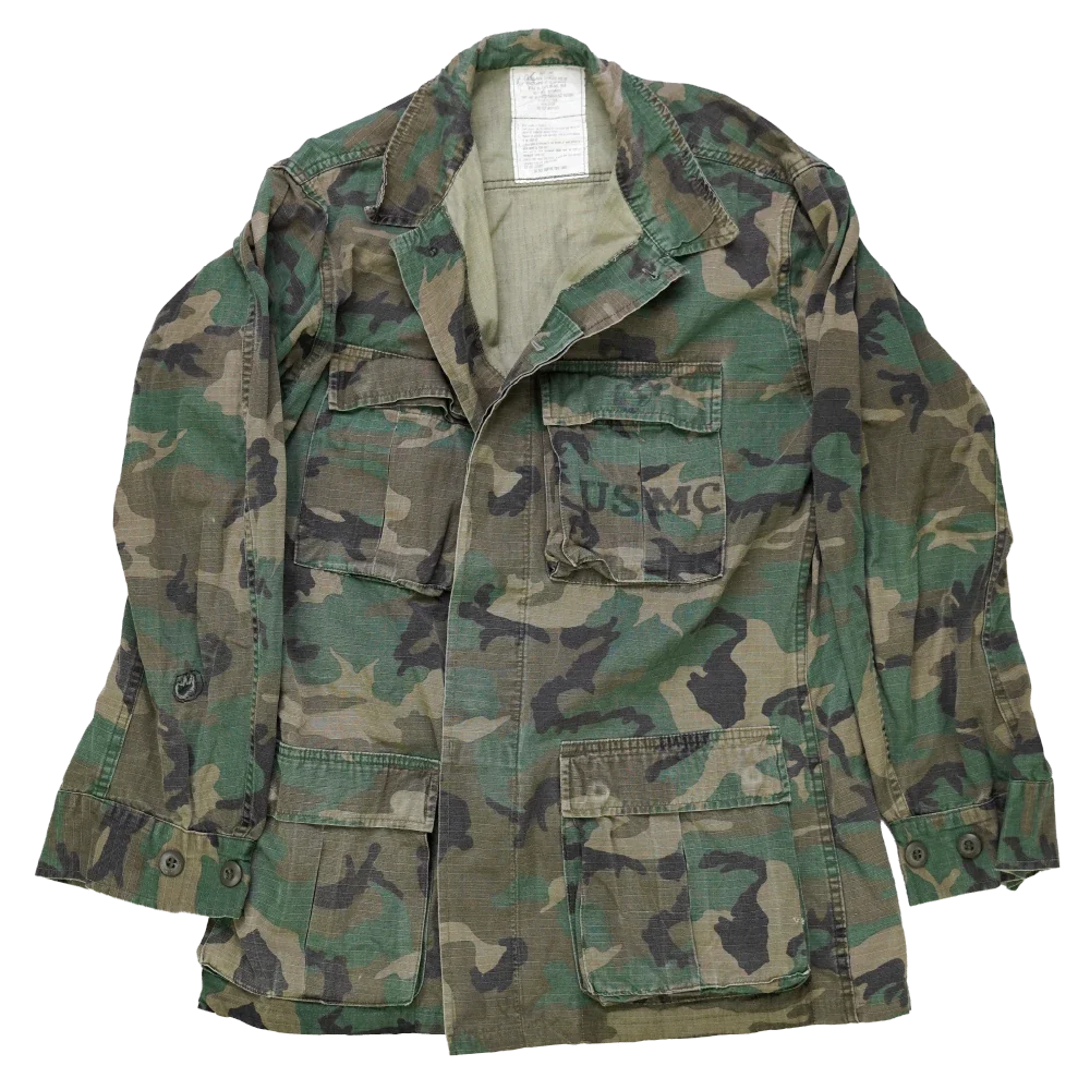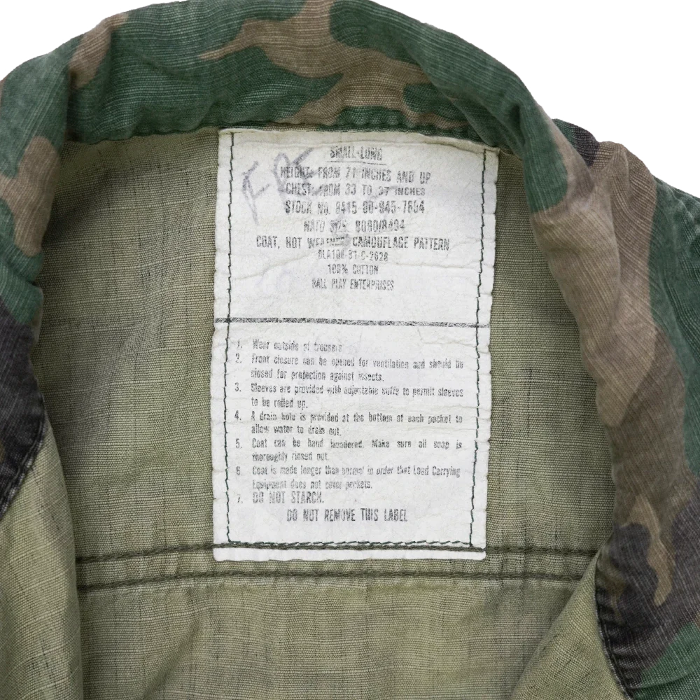 USMC RDF ERDL ripstop shirt in Small Long. This is a lightweight field shirt with a ripstop construction and USMC pocket insignia. Manufacture date is 1981.