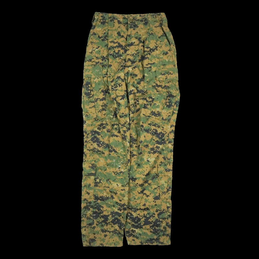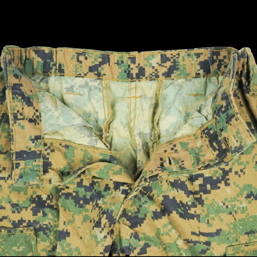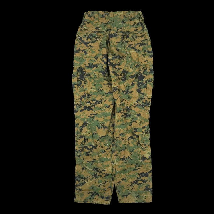 USMC FROG trousers in woodland MARPAT pattern. Constructed with multiple utility pockets and a button fly. Elasticated waist is present. Manufacture date is 2010.