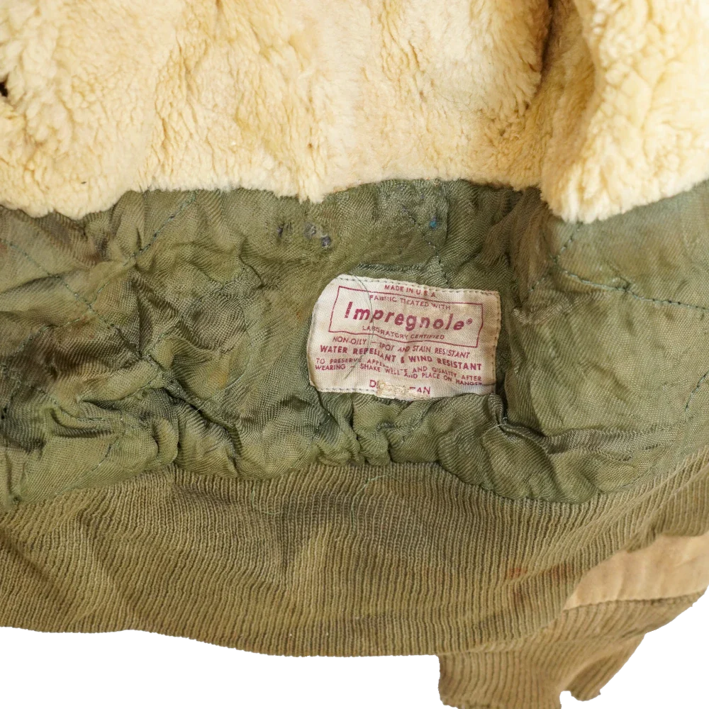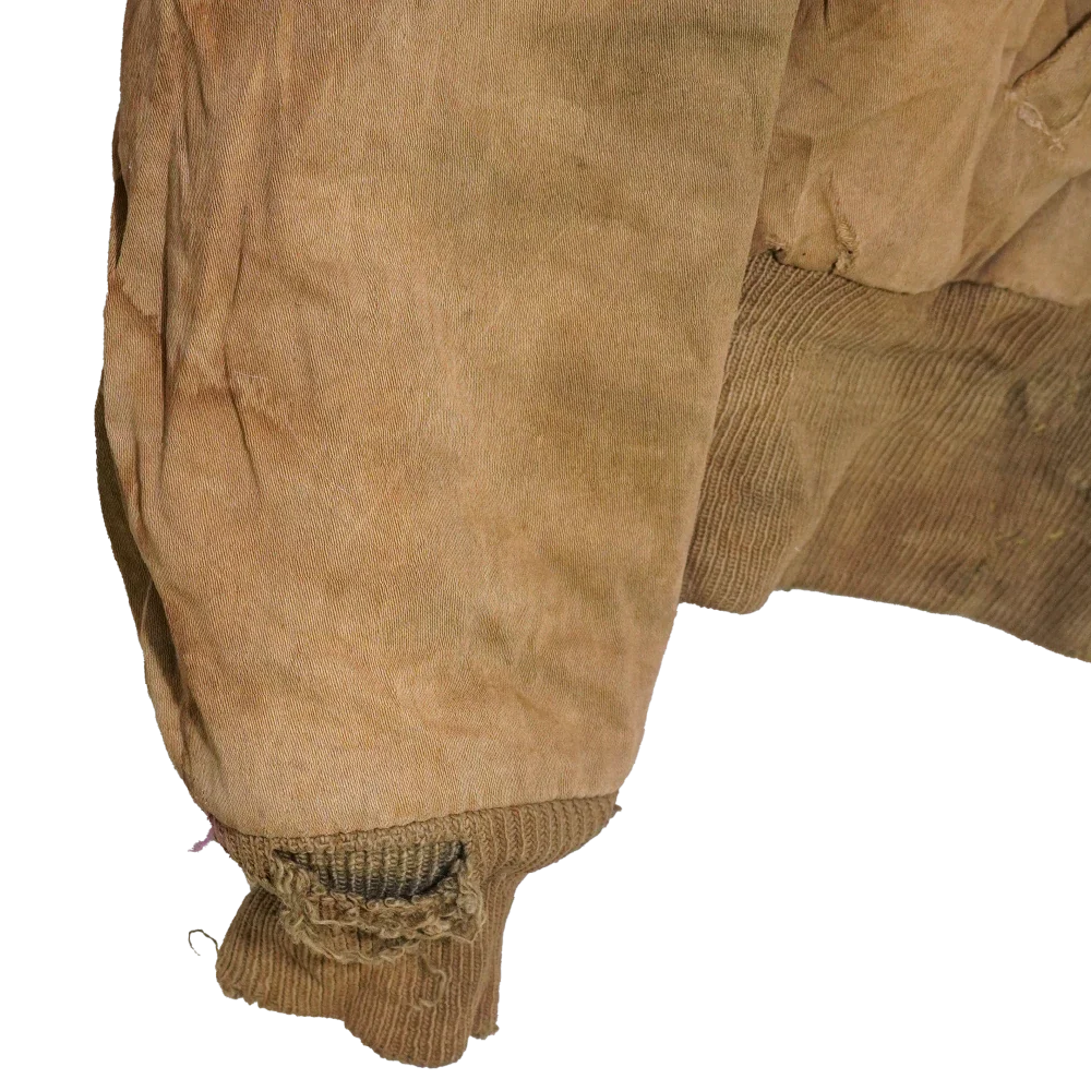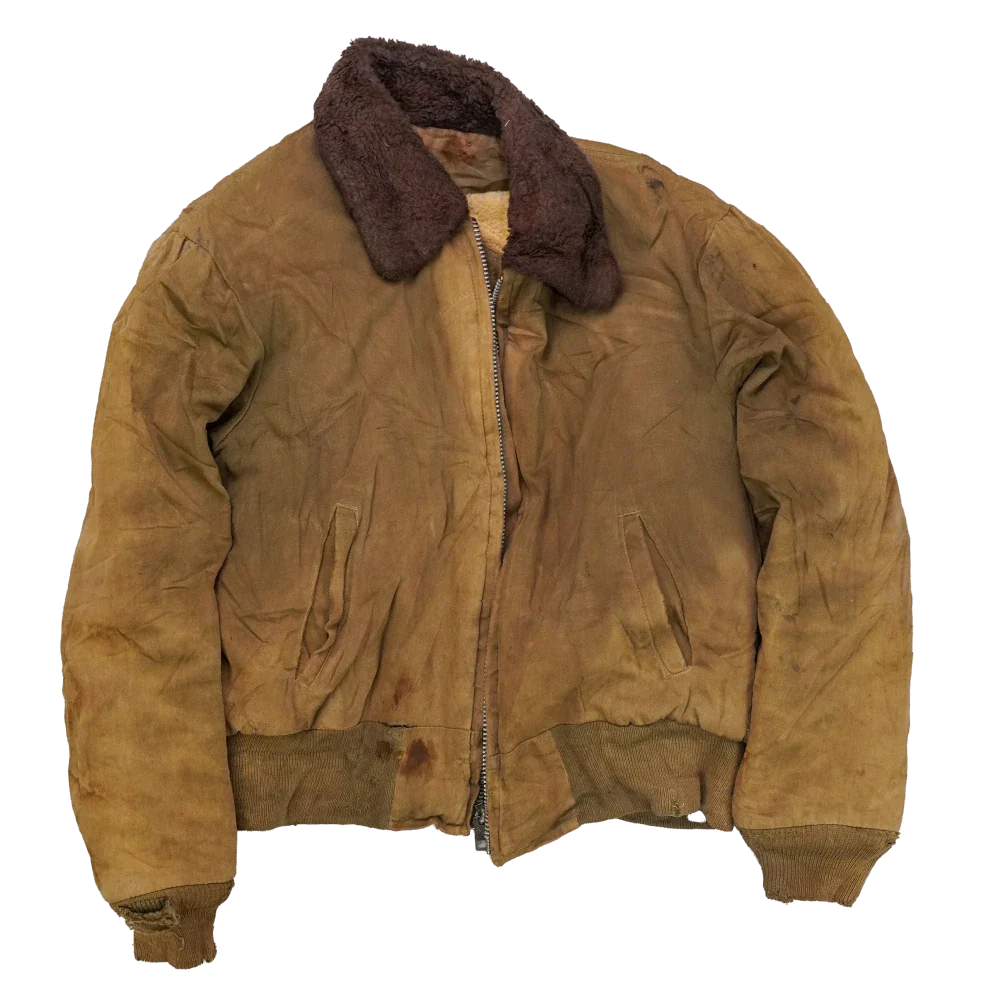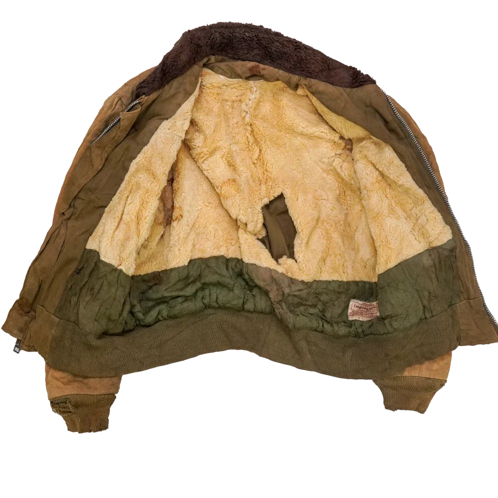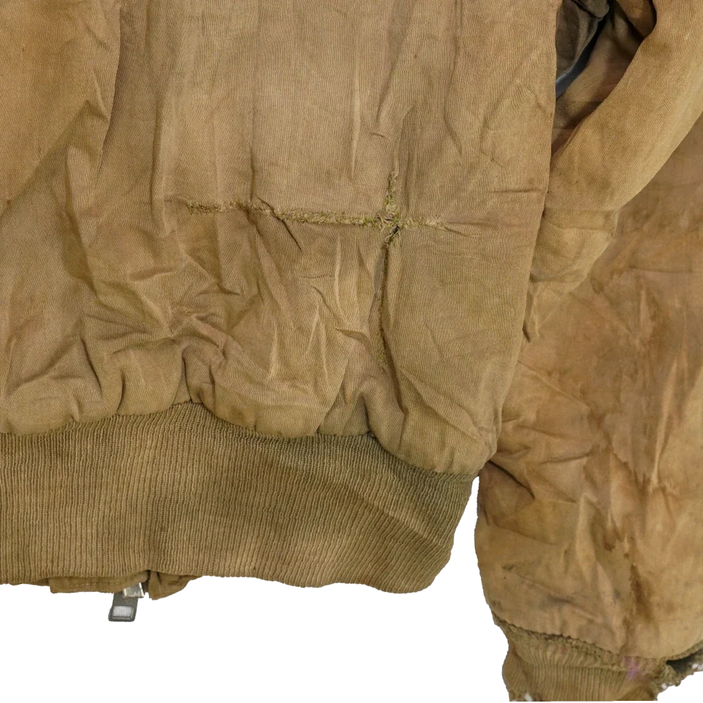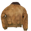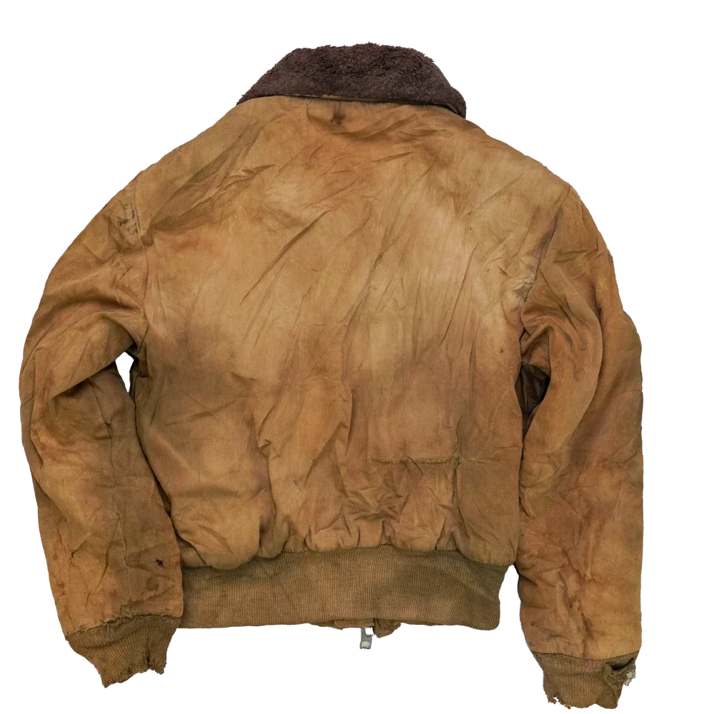 Vintage B-15 flight jacket in heavily distressed condition. It has visible stains, holes, and rough wear throughout.