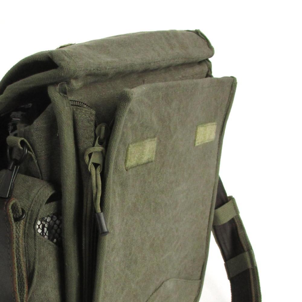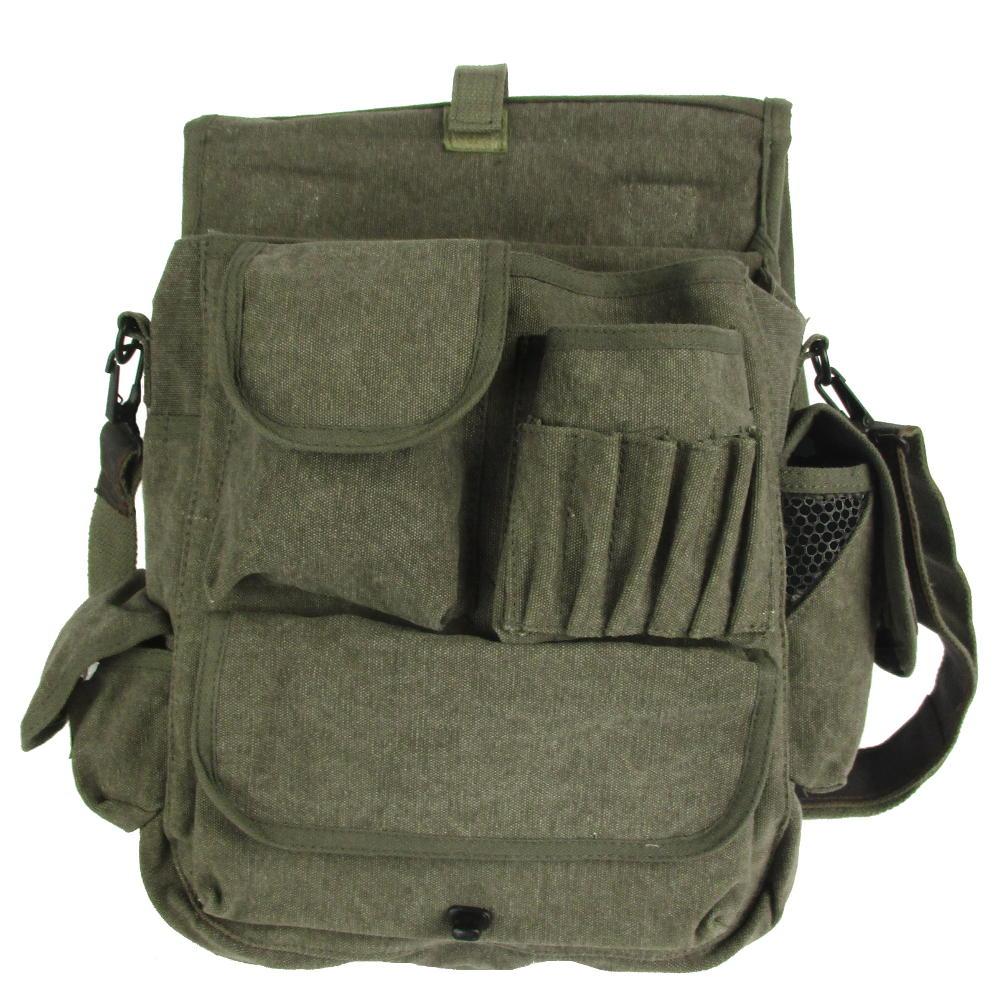 The front flap unlocks with a turning mechanism and features a two-way zipped pocket. Lifting the flap reveals numerous pouches and a clear plastic document pocket. These pouches are made to store a cell phone, pens and other every day carry gear. The main compartment could fit a laptop or tablet which is secured in by the front flap. On the rear is a final compartment containing an internal pocket and nine small pouches which could be useful for storing cables, USB devices and other gadgets. The removable shoulder strap features leather accents with a metal buckle. Travel with all your tech and daily needs in this vintage military style shoulder bag by Rothco.