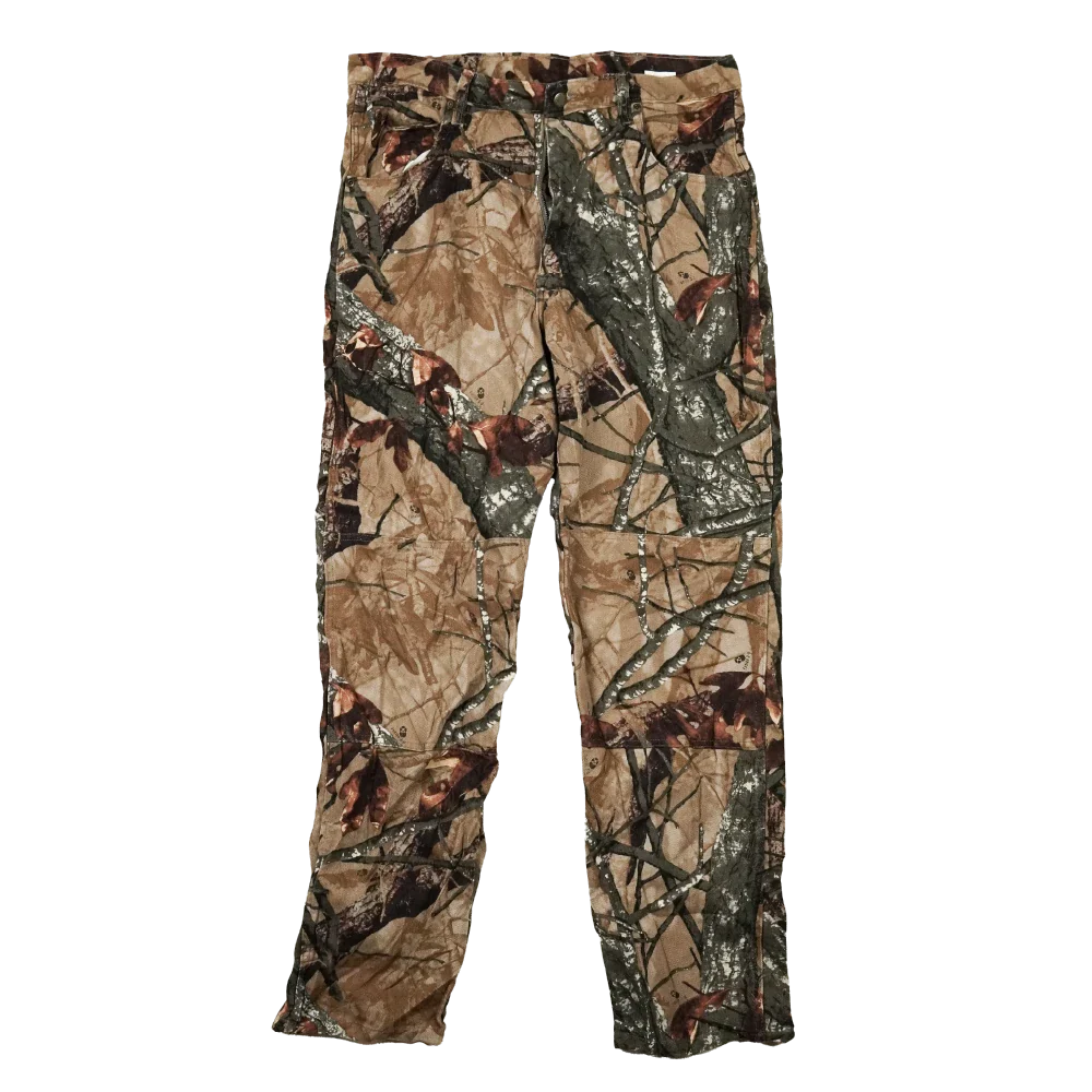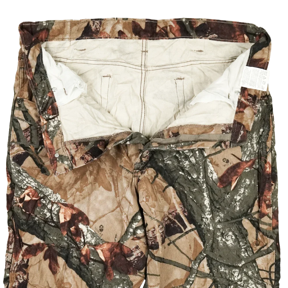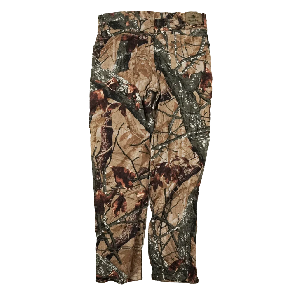 Commercial Wrangler camouflage cargo pants in a lightweight-to-midweight woven fabric. They have a straight-leg cut with belt loops and a button waist closure.
