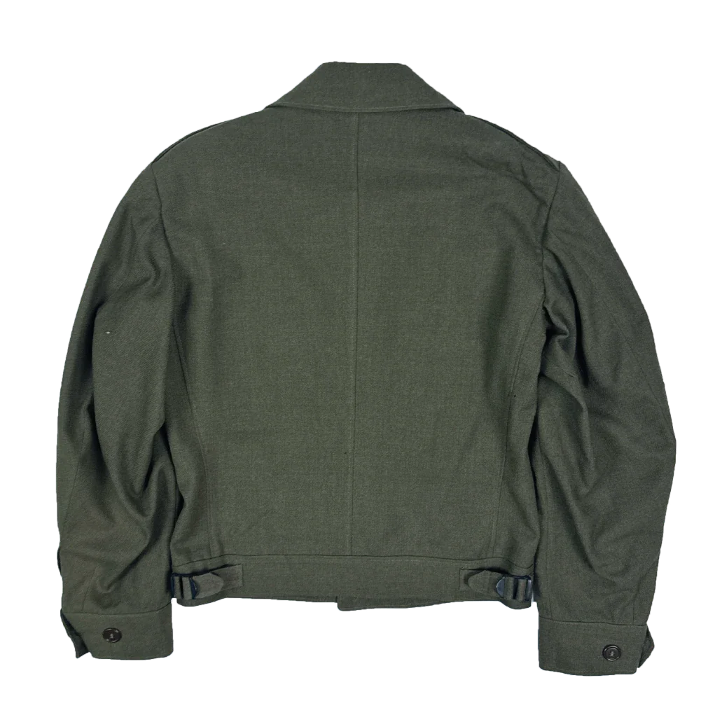 WWII wool Ike (M-1944, Eisenhower) jacket. Features two chest pockets with both external and internal access, buckled waist adjusters, and buttoned cuffs.