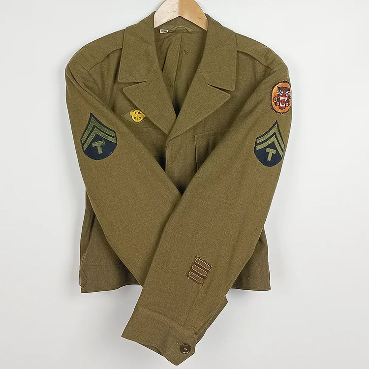 WWII wool Ike (M-1944, Eisenhower) jacket with Tank Destroyers, Technical Corporal, Honorable service and 1.5 years overseas bars.